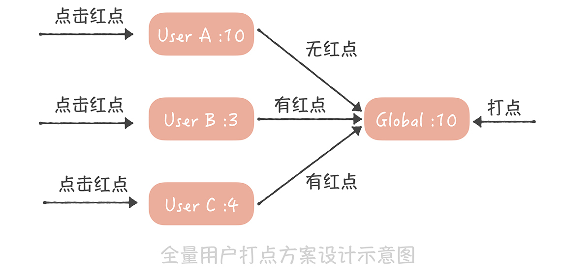 这个红点和系统通知类似,也是一种通知全量用户的手段,如果逐个通知用户,延迟也是无法接受的。因此你可以采用和系统通知类似的方案。
