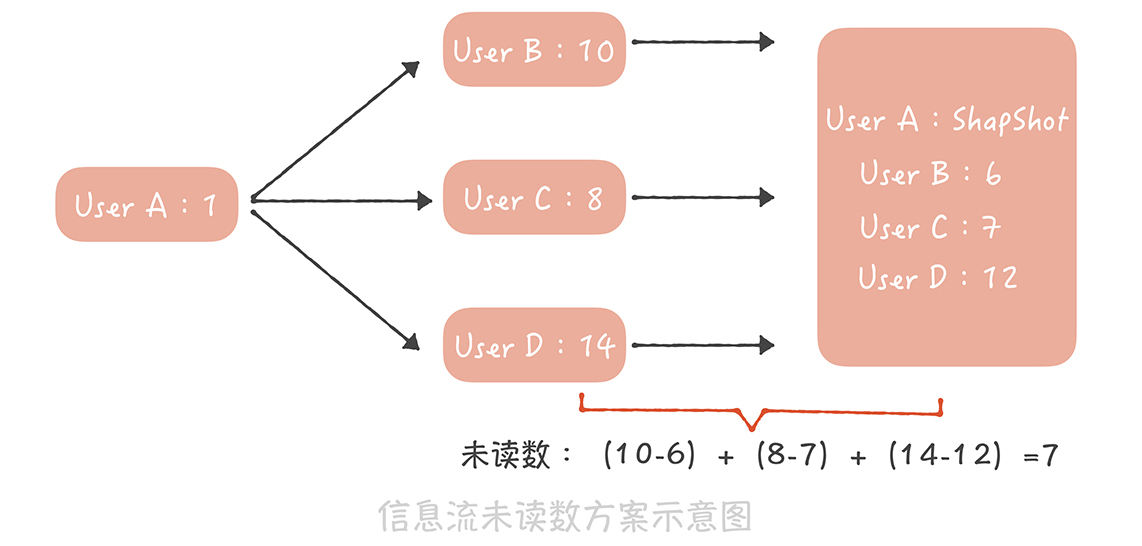 这似乎是一个可行的技术方案,然而它给所有人增加未读计数,会消耗非常长的时间。你计算一下,假如你的系统中有一个亿的用户,给一个用户增加未读数需要消耗 1ms,那么给所有人都增加未读计数就需要 100000000 * 1 /1000 = 100000 秒,也就是超过一天的时间;即使你启动 100 个线程并发的设置,也需要十几分钟的时间才能完成,而用户很难接受这么长的延迟时间。