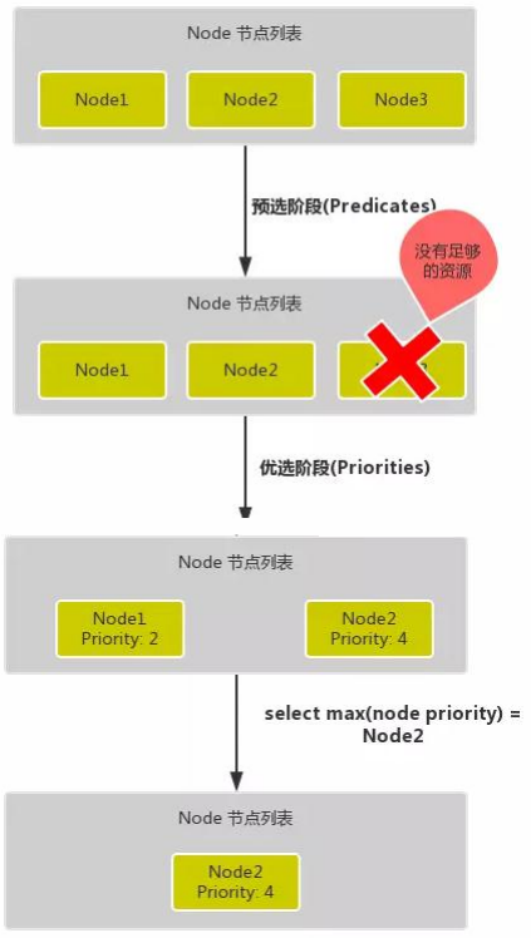 Predicates阶段首先遍历全部节点,过滤掉不满足条件的节点,属于强制性规则, 这一阶段输出的所有满足要求的Node将被记录并作为第二阶段的输入,如果所有的节点都不满足条件,那么Pod将会一直处于Pending状态,直到有节点满足条件,在这期间调度器会不断的重试。所以我们在部署应用的时候,如果发现有Pod 一直处于Pending状态,那么就是没有满足调度条件的节点,这个时候可以去检查下节点资源是否可用。