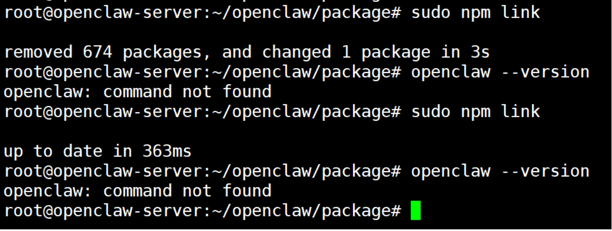 sudo ln -sf ~/openclaw/package/cli.js /usr/local/bin/openclaw