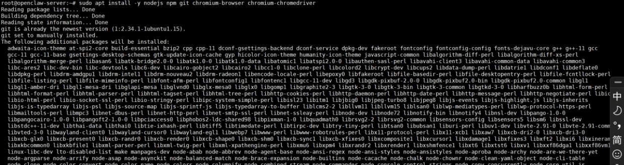 sudo apt install -y nodejs npm git chromium-browser chromium-chromedriver
