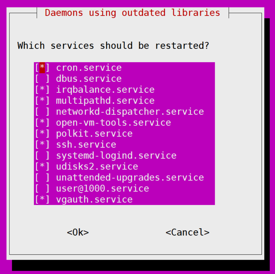 这是 Ubuntu 系统更新后弹出的服务重启提示,部分守护进程仍在使用旧版本的库文件,需要重启才能生效。直接选择ok即可