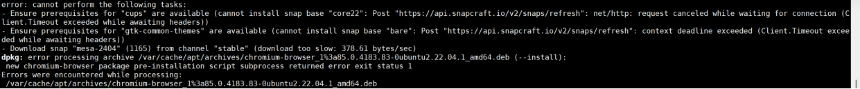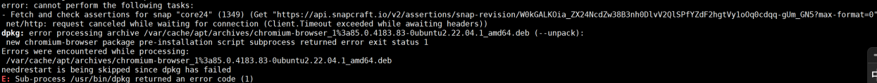 安装 chromium-browser 时,dpkg 子进程返回了错误代码 (1),导致安装失败。