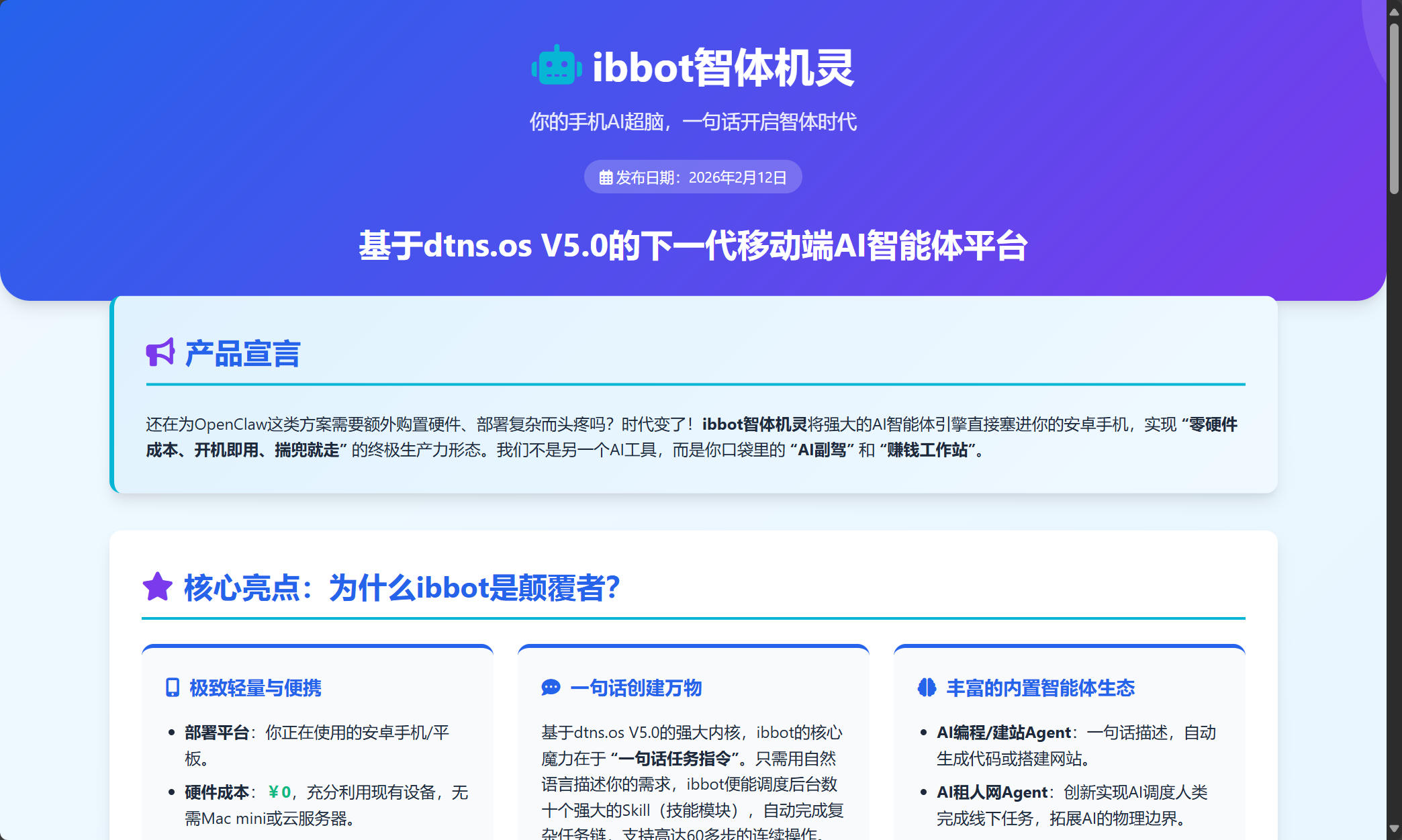 还在为OpenClaw这类方案需要额外购置硬件、部署复杂而头疼吗?时代变了!ibbot智体机灵 将强大的AI智能体引擎直接塞进你的安卓手机,实现 "零硬件成本、开机即用、揣兜就走" 的终极生产力形态。我们不是另一个AI工具,而是你口袋里的 "AI副驾" 和 "赚钱工作站" 。