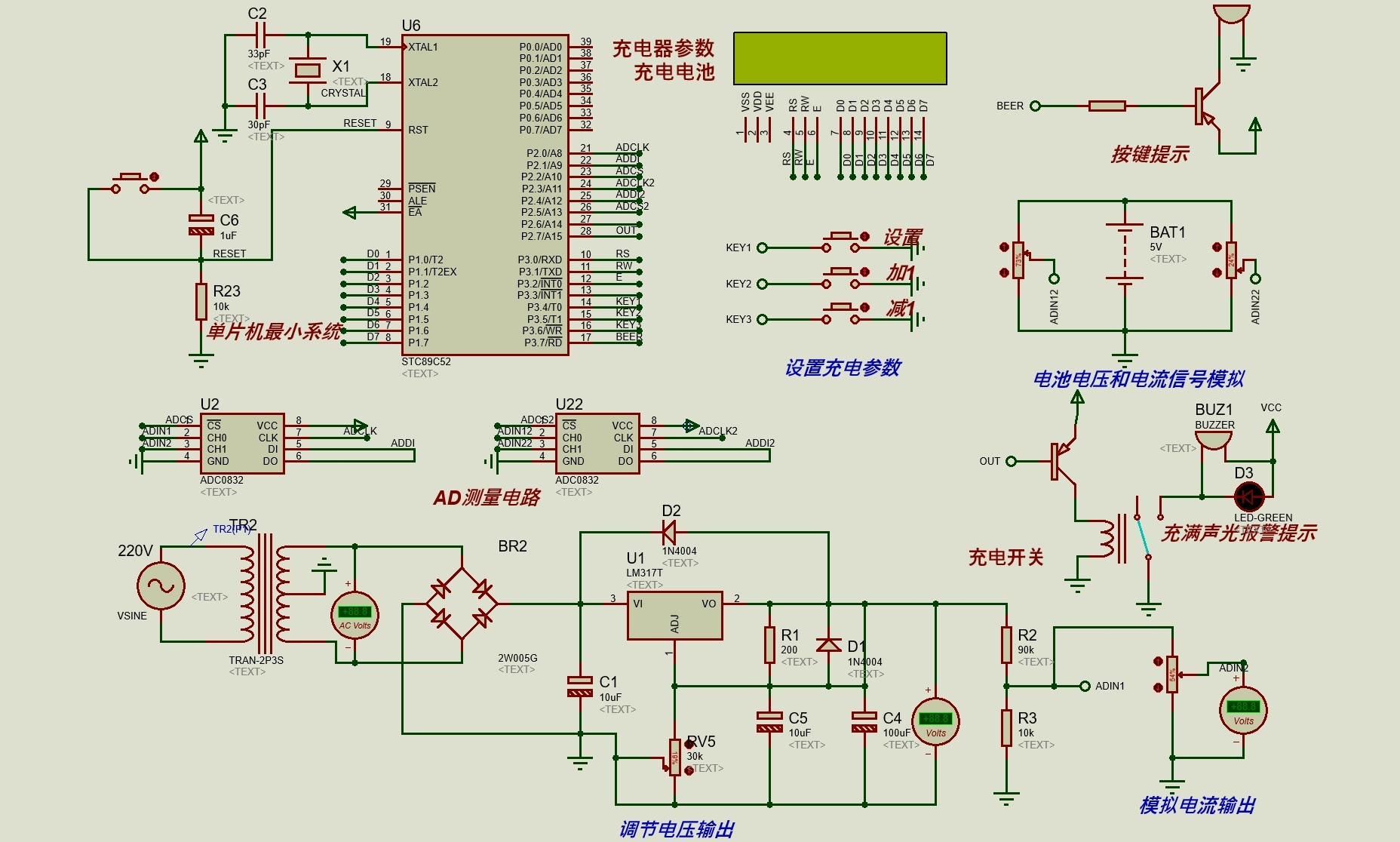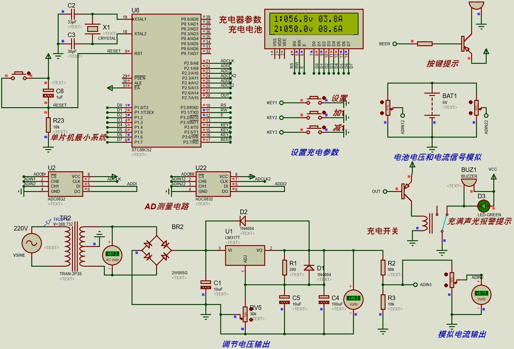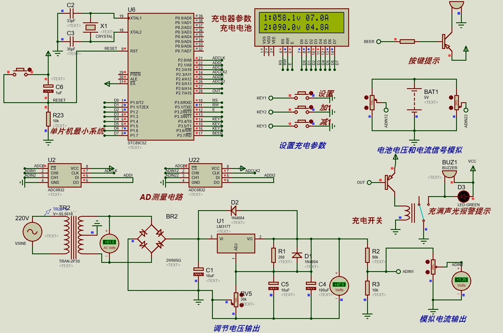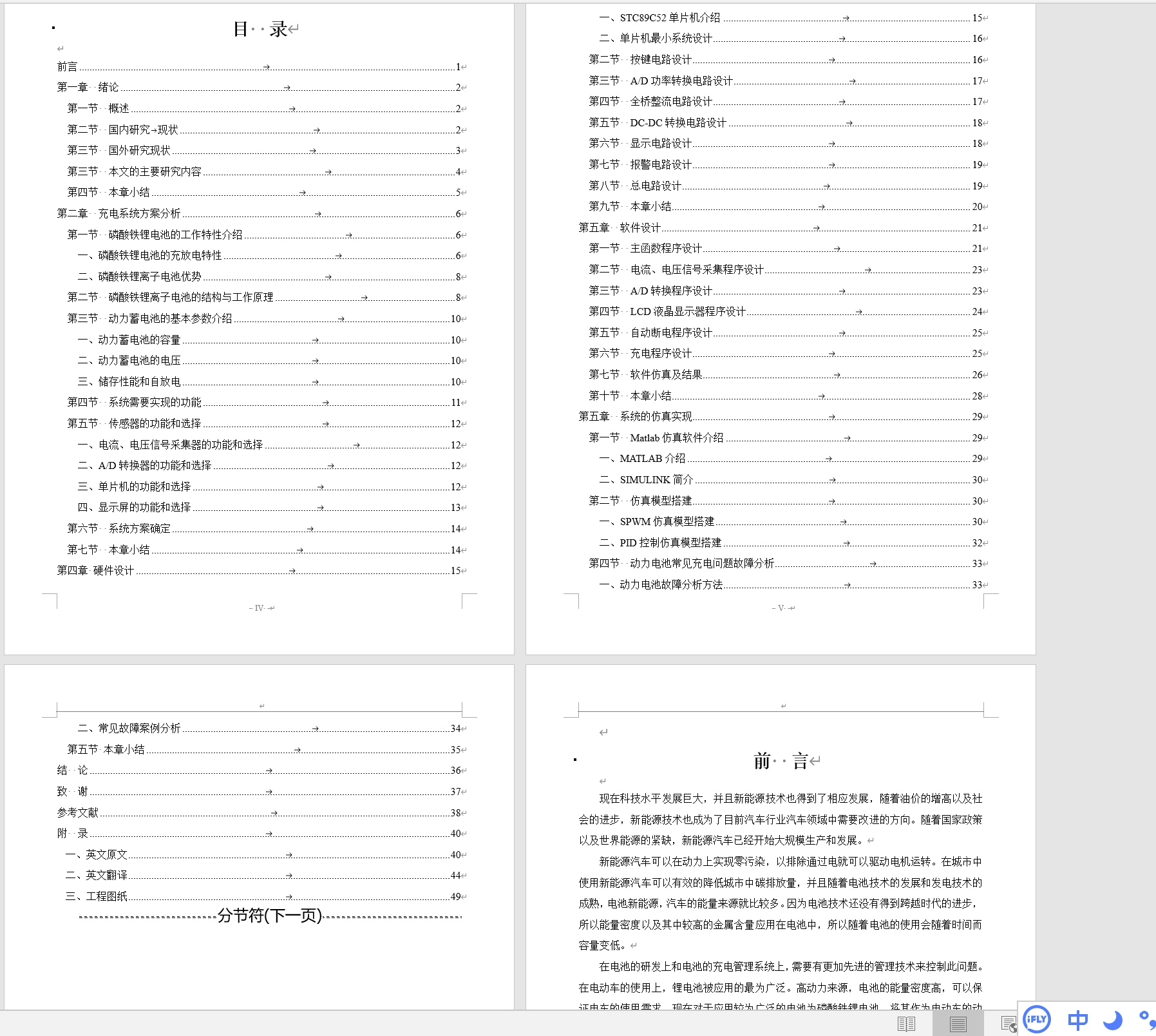 动力电池充电系统设计(mtalab仿真+proteus仿真+英文文献+PPT+详细过程说明书) 现在科技水平发展巨大,并且新能源技术也得到了相应发展,随着油价的增高以及社会的进步,新能源技术也成为了目前汽车行业汽车领域中需要改进的方向。 随着国家政策以及世界能源的紧缺,新能源汽车已经开始大规模生产和发展。 动力电池充电管理系统也成为了管理中最为核心的部分。 本文题目为动力电池充电系统设计,通过对动力电池的发展背景以及研究情况详细的了解后,对磷酸铁锂电池的充放电特性、电池优势以及内部电池结构以及工作原理掌握。 电池的基本参数主要有电池的容量、电压以及存储性能与放电性能。 针对与动力电池组特性设计出硬件电路方案,使用电压电流检测传感器、LCD显示器、按键等核心部件对系统进行设计。 完成整个系统的全部电路模块合计,根据电路模块实现系统的控制电气部分设计,完成硬件电路的逻辑电路设计与验证。 最后使用MATLAB对系统的核心功能进行仿真,SPWM模型搭建、PID控制模型以及控制策略模块来优化系统的软件部分。 本文还针对动力电池组常见故障分析、并且引用目前已经确认的实际故障案例,可以根据故障案例对动力电池组进行故障分析。 本次设计通过硬件、软件以及仿真软件MATLAB来对系统进行设计与验证,充分的对动力电池充电系统进行研究。 可对此系统进行推广。 资料包含: PPT 说明书 原理图工程文件 原理图截图 仿真模型工程文件 源代码工程 仿真截图 搭建视频 英文文献及翻译 visio流程图工程 matlab仿真截图