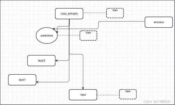 下图为 TensorBoard 可视化的完整工作流程示意图:train(训练)、cross_entropy(交叉熵)、accuracy(准确率)、predictions(预测值)、layer2(第二层)、layer1(第一层)、input(输入)