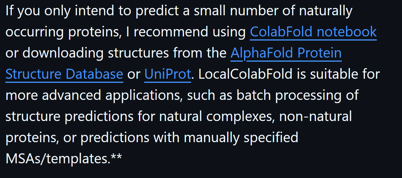 - 一些结构预测软件没有那个实力部署的,比如说AlphaFold3只能平时白嫖网页端,那可以看一下ColabFold,这个我之前提过很多次了,只要自己有一些简单的算力基础