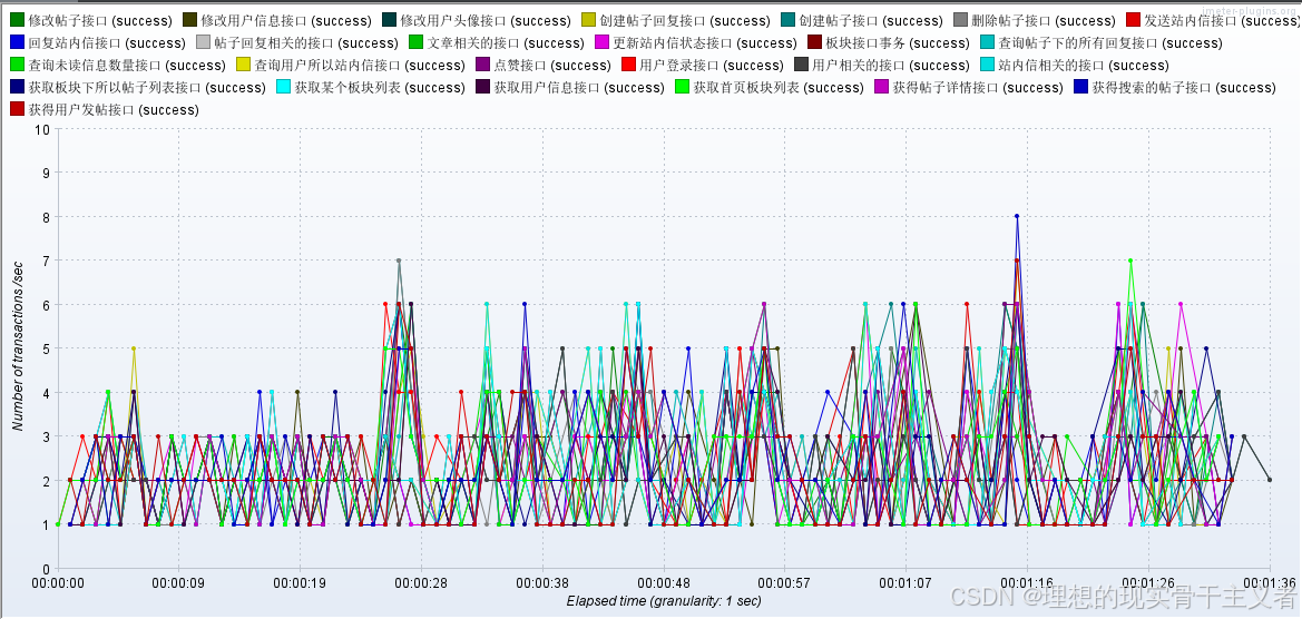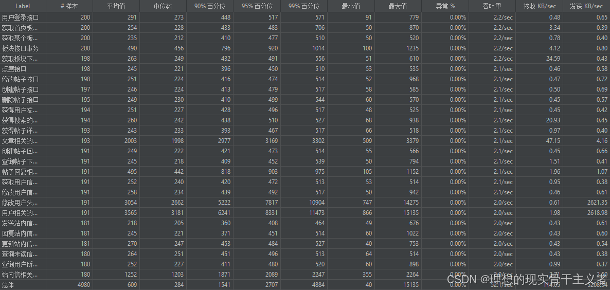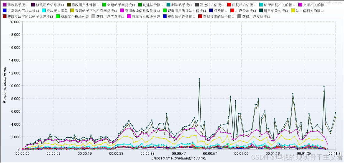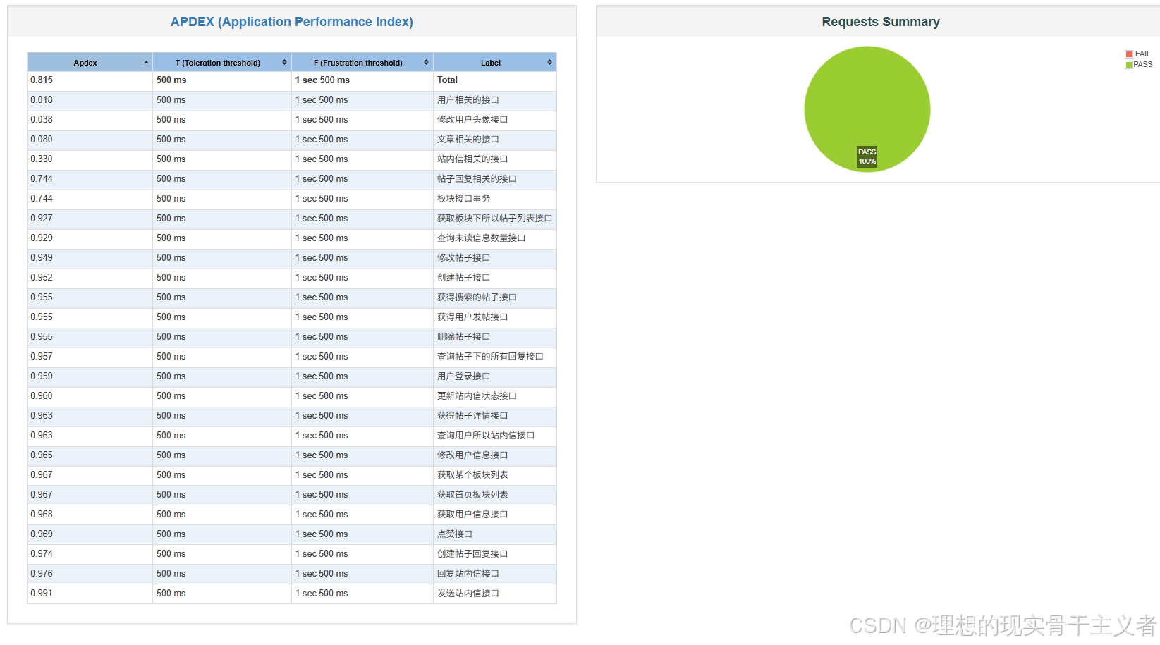 部分接口(如 "修改用户头像接口"、"用户相关的接口"、"板块接口事务")的最大响应时间超过 10 秒,是主要性能瓶颈。 - APDEX 表现