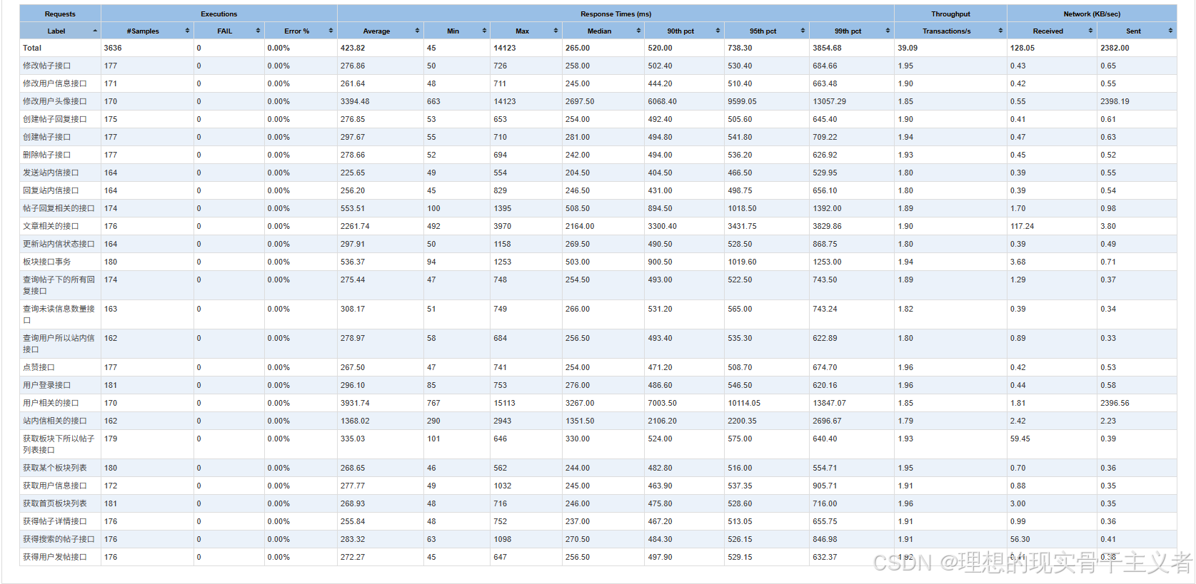 成功率:本次测试共执行 3636 次请求,错误率为 0.00%,所有请求均成功,系统稳定性表现优异。