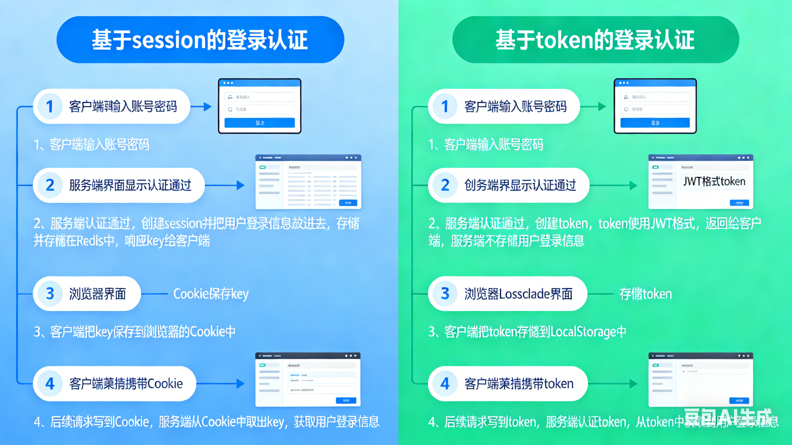 你总结得非常清晰和准确!这两种登录认证方式的核心流程你都已经完全抓住了。为了让你的理解更完善,我结合一些细节和补充点,帮你把这两个方案梳理得更透彻。