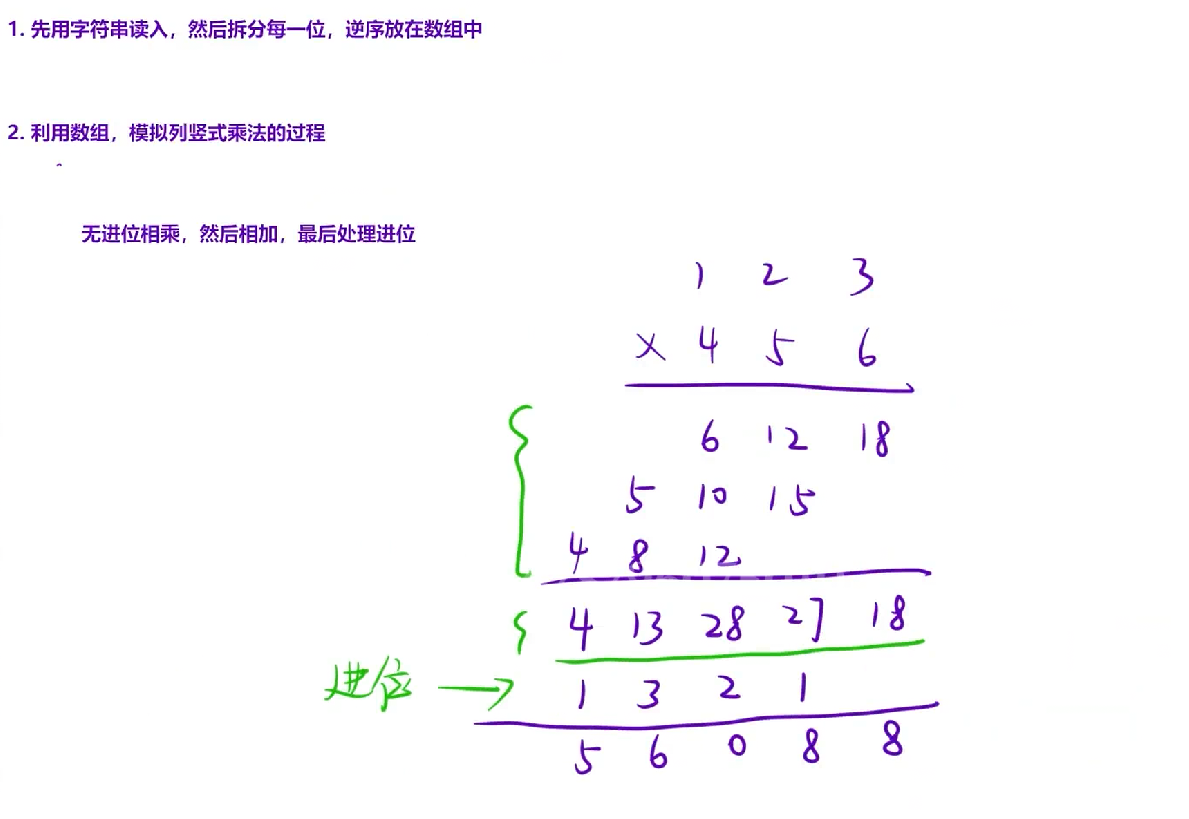 00123这样的无效格式。 - 逐位累加:先完成所有位的相乘累加,再统一处理进位,比边乘边进位更清晰高效。