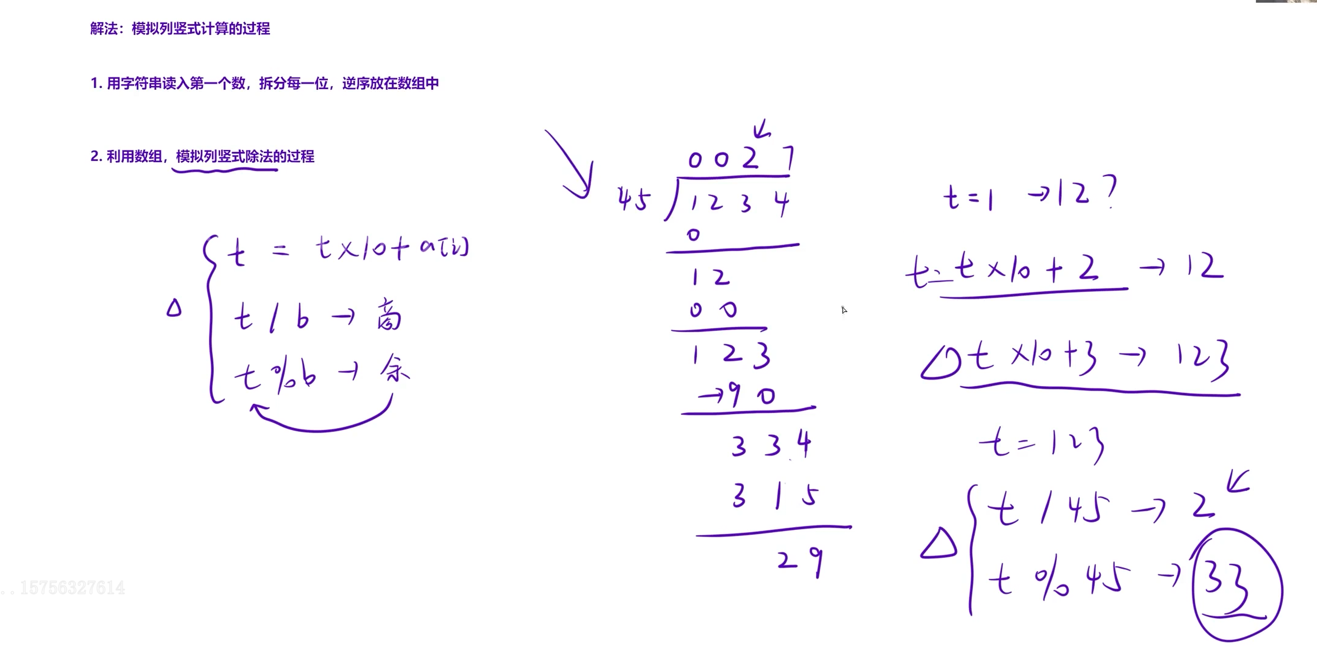 这道题的特点是:被除数是高精度大数(可达 (10^{5000})),除数是低精度整数( 10^9)。我们可以模拟小学竖式除法的"逐位试商"过程,用数组存储大数,用普通整数做除法运算,避免复杂的高精度除法。