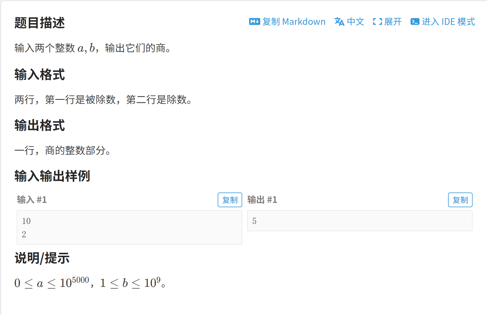 long long存储中间余数t,防止t * 10 + a[i]时溢出。 - 边界处理:当被除数为0或小于除数时,商为0,需要单独处理,避免输出空串。
