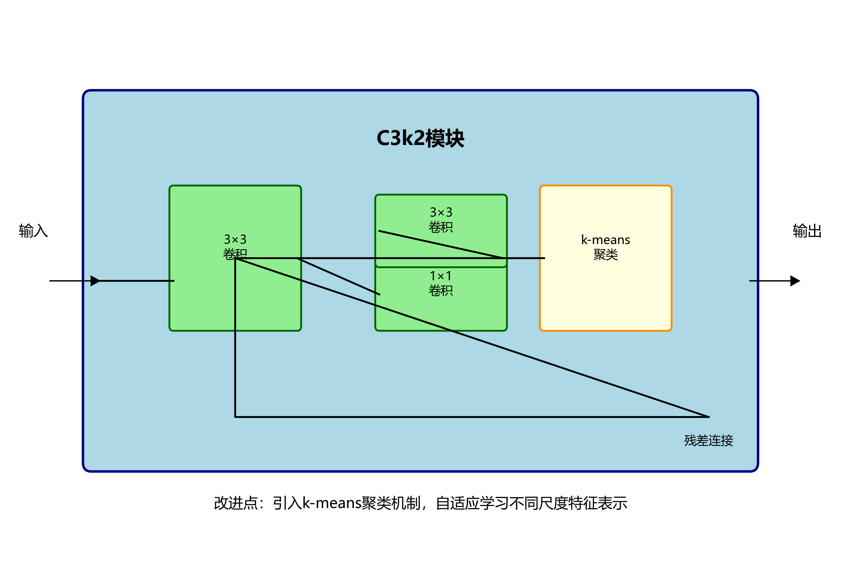 C3k2模块是一种改进的跨阶段部分网络(CSP)结构,通过引入k个分支来增强特征提取能力。其数学表达式为: