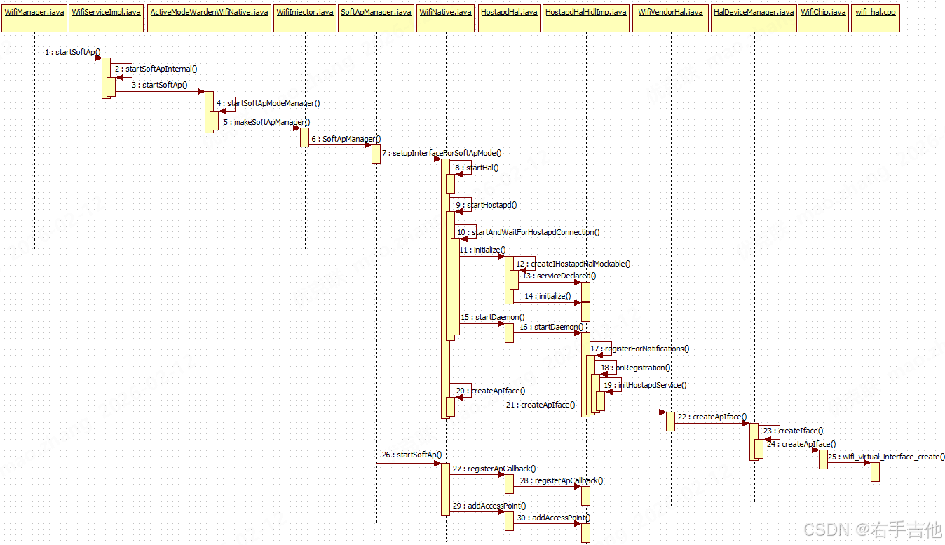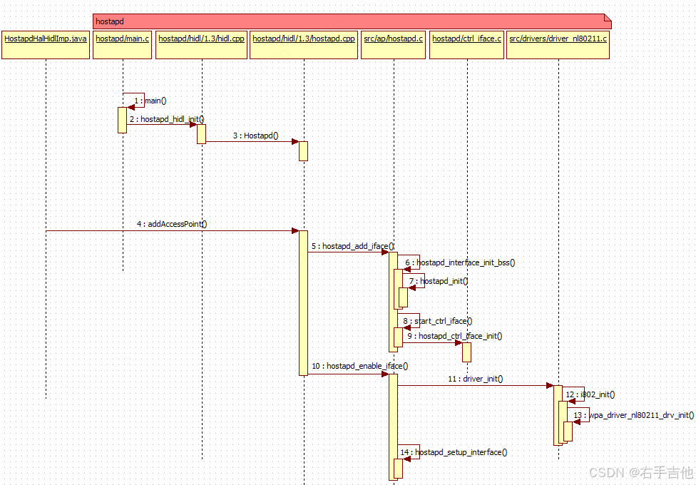 为IHostapd服务,其中HostapdHalHidlImp.java为Framework和Hal层交互的关键类,mIServiceManager.registerForNotifications监听IHostapd服务的启动,当IHostapd启动后,HostapdHalHidlImp获取到IHostapd实例。