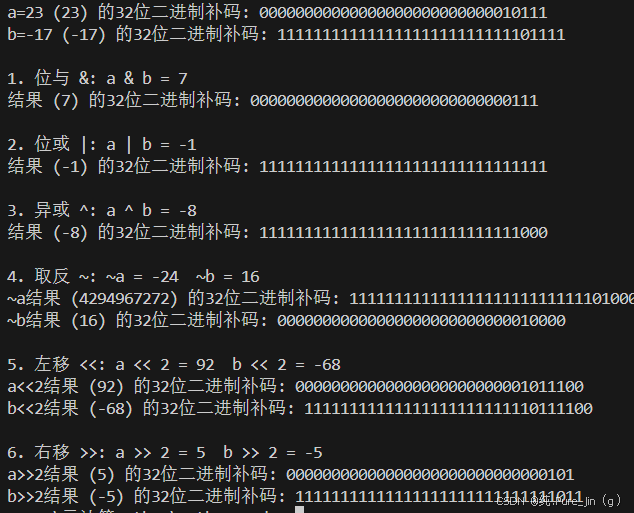 print("\n6. 右移 >>: a >> 2 =", a >> 2, " b >> 2 =", b >> 2)