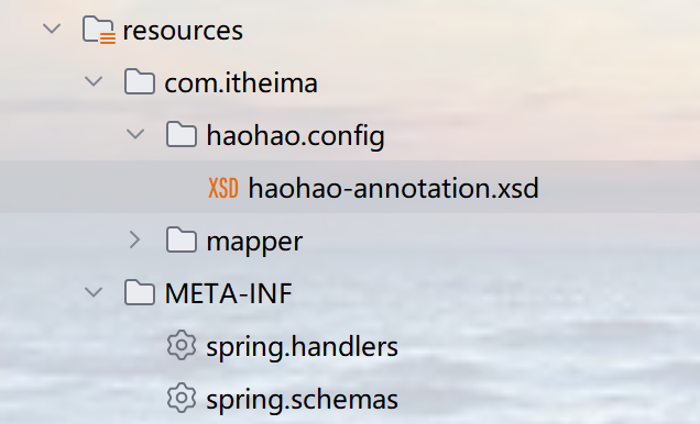 - 将自定义标签的约束 与 物理约束文件与网络约束名称的约束 以键值对形式存储到一个spring.schemas文件里,该文件存储在类加载路径的 META-INF 里,Spring 会自动加载到;