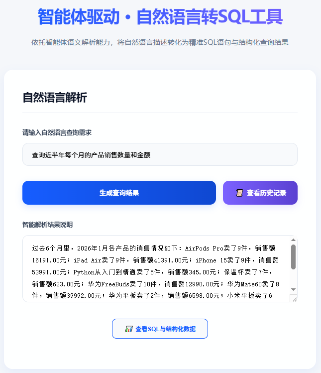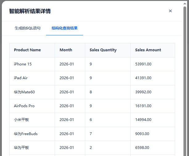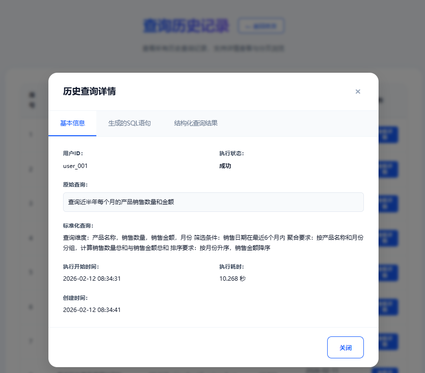 - 用户体验友好:兼顾非技术用户(口语化结果)与技术用户(SQL详情查看)需求