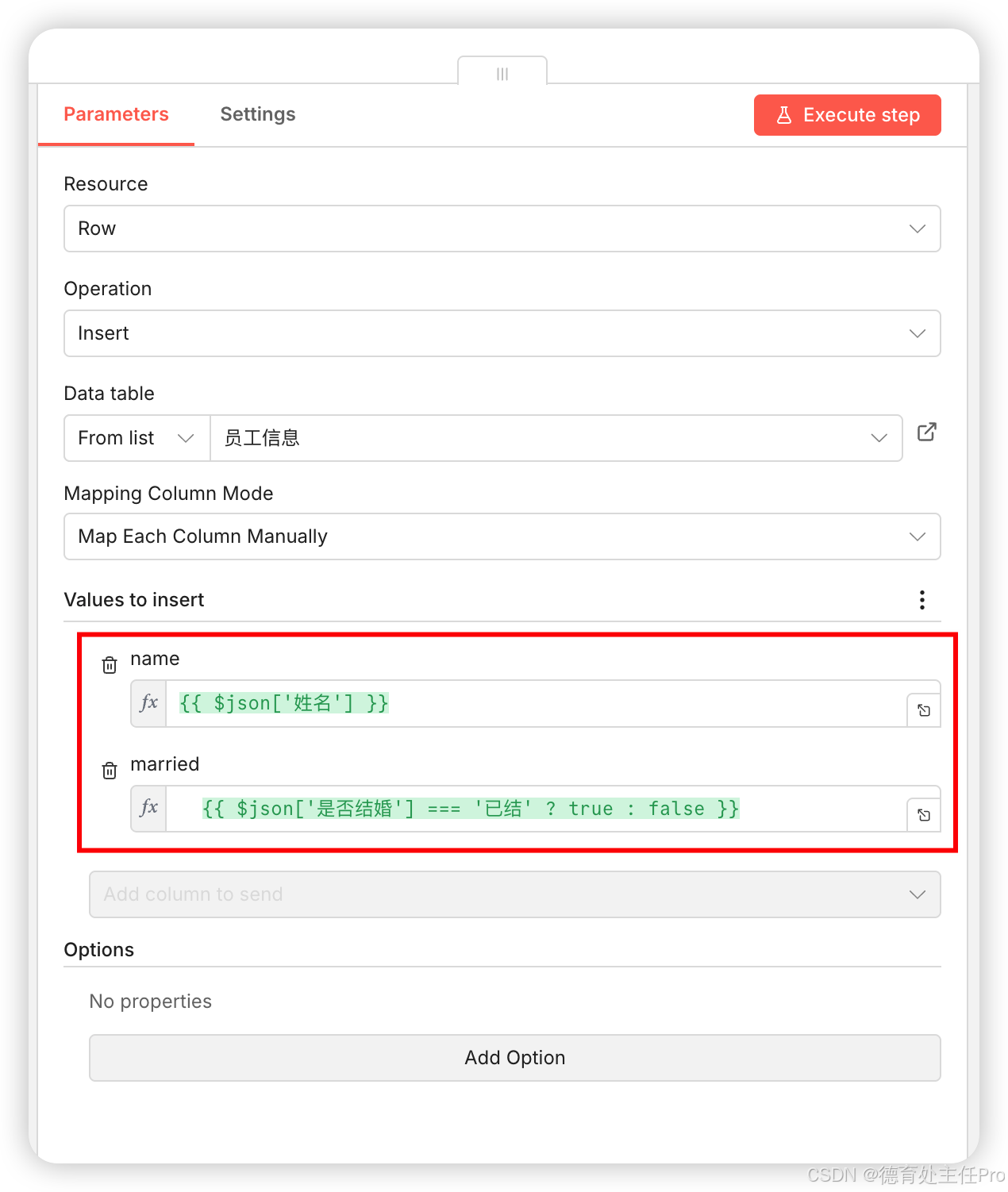 married 这项填入 {``{ $json['是否结婚'] === '已结' ? true : false }},这是 JS 的三元运算符,判断上一个节点传入的"是否结婚"这项的值是否为"已结",如果是的话就存入 true ,否则存入 false。