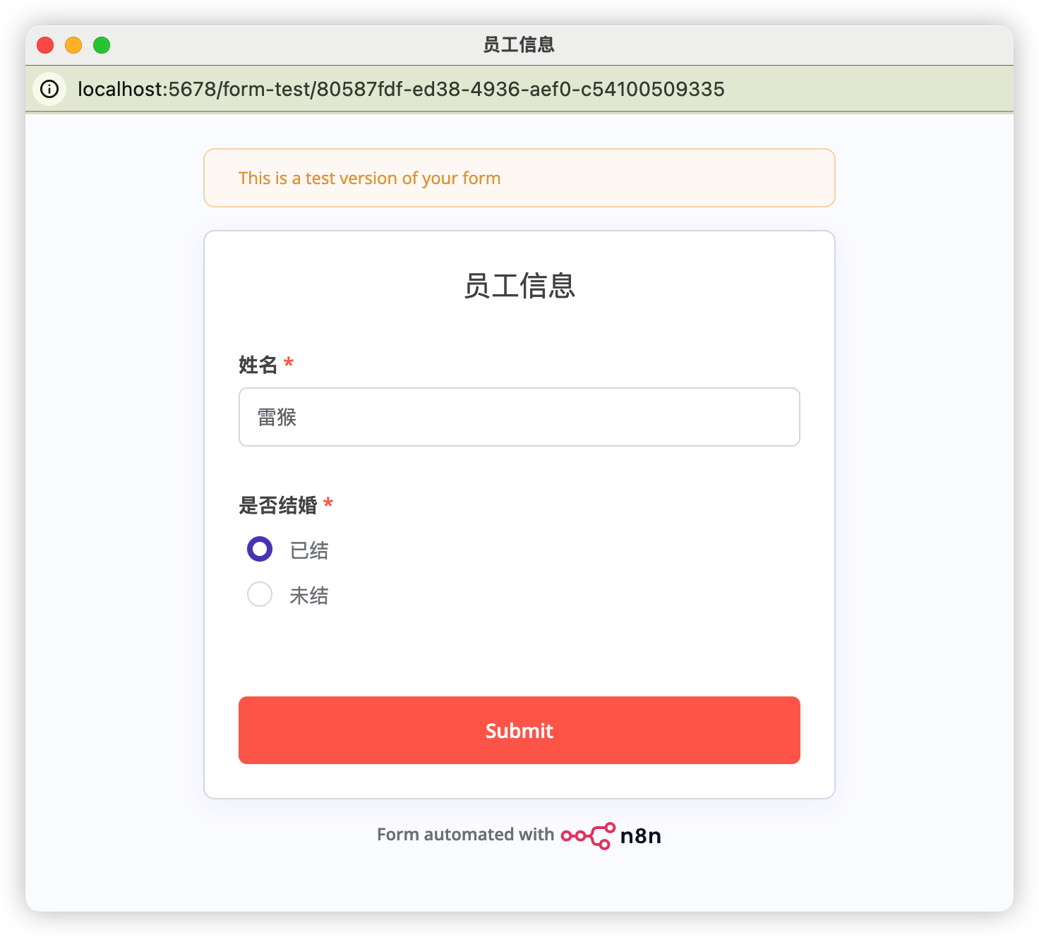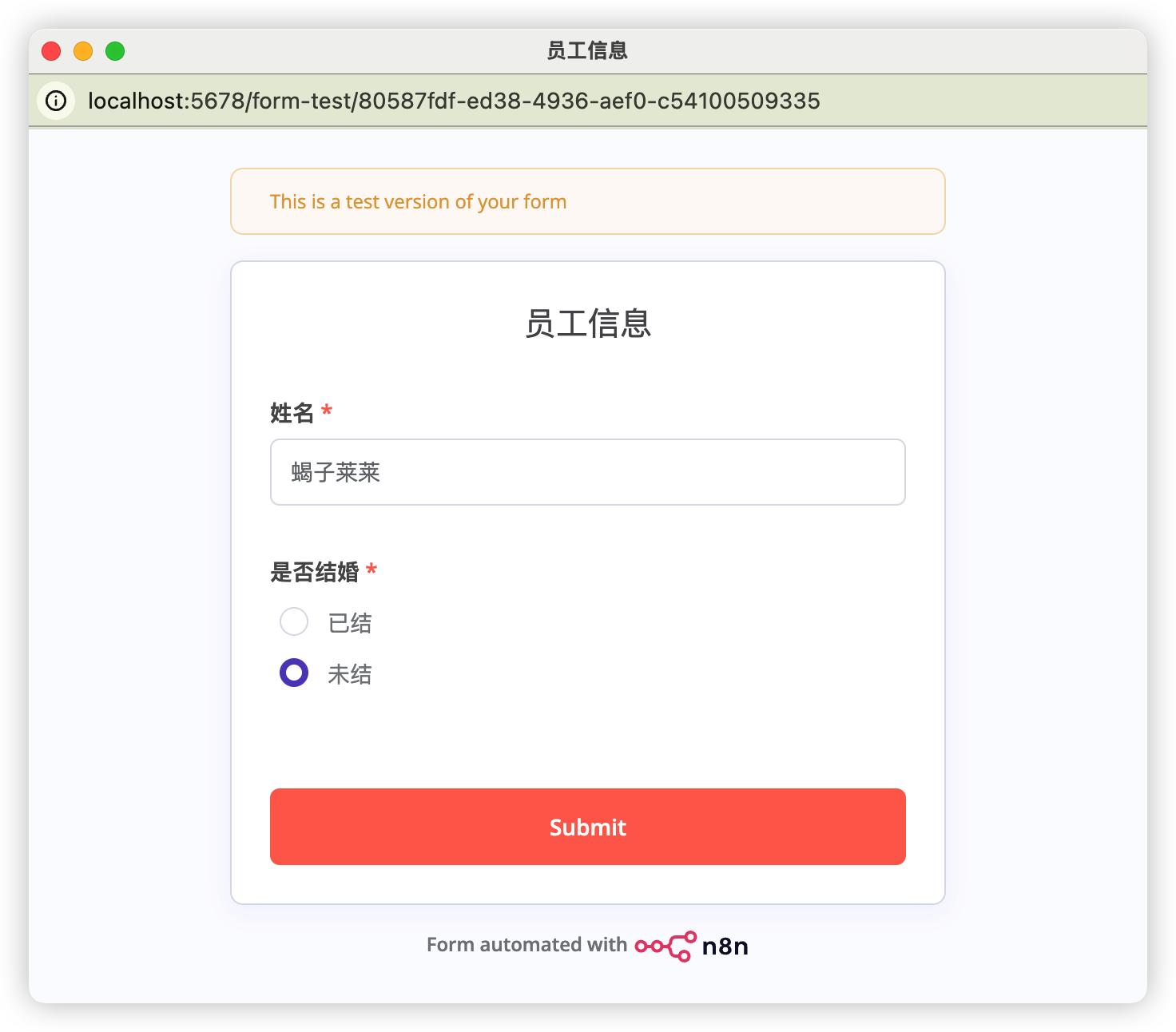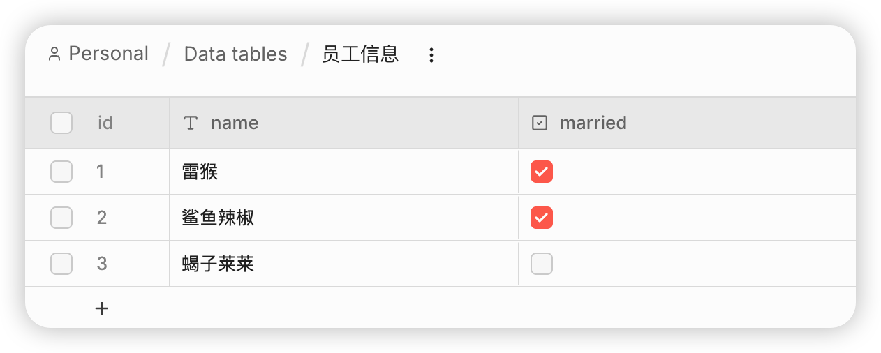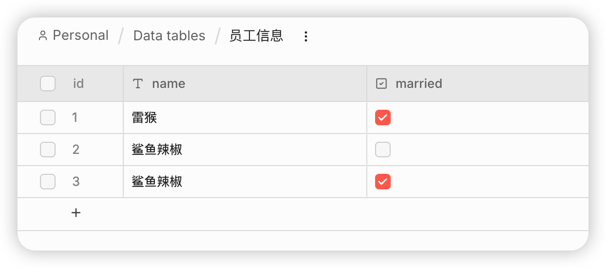 只有2个字段,表单的"姓名"对应数据表里的 name;表单的"是否结婚"对应数据表里的 married。