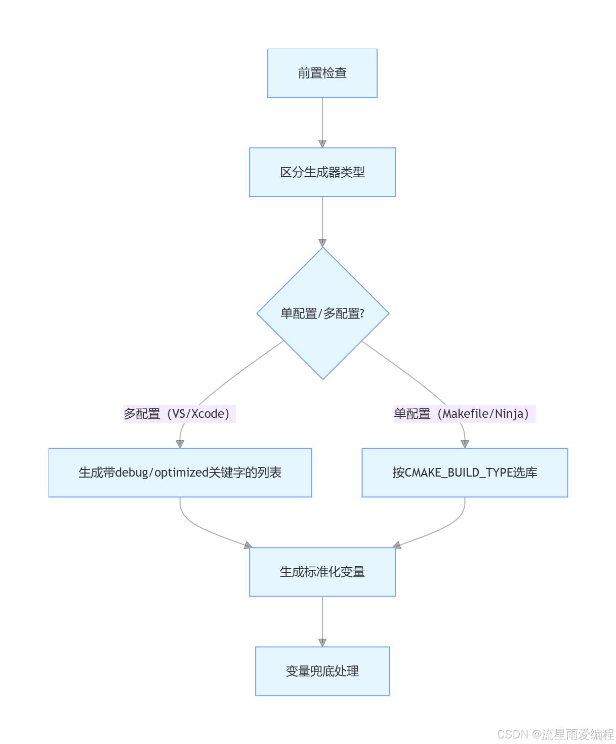 - 环境适配:核心是区分 "多配置 / 单配置生成器",分别采用 "关键字列表" 和 "单一路径" 的赋值逻辑;