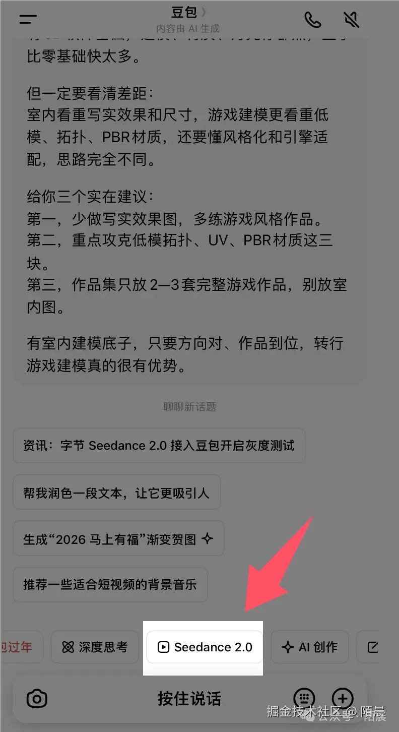 升级到最新版豆包,下方即可看到入口。对话框-Seedance2.0-选择 2.0 模型;
