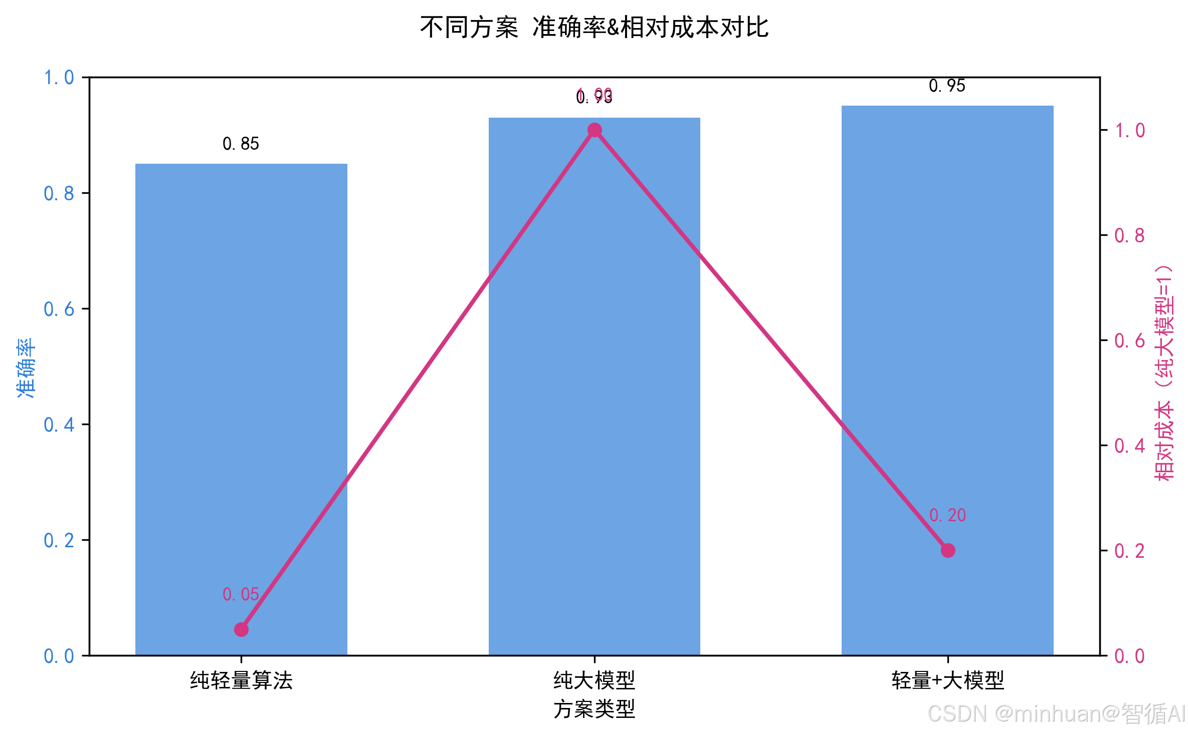 cost_ratios = [1.0, len(low_conf_text)/len(X_test)] # 成本比例(纯大模型=1,组合方案=低置信比例)