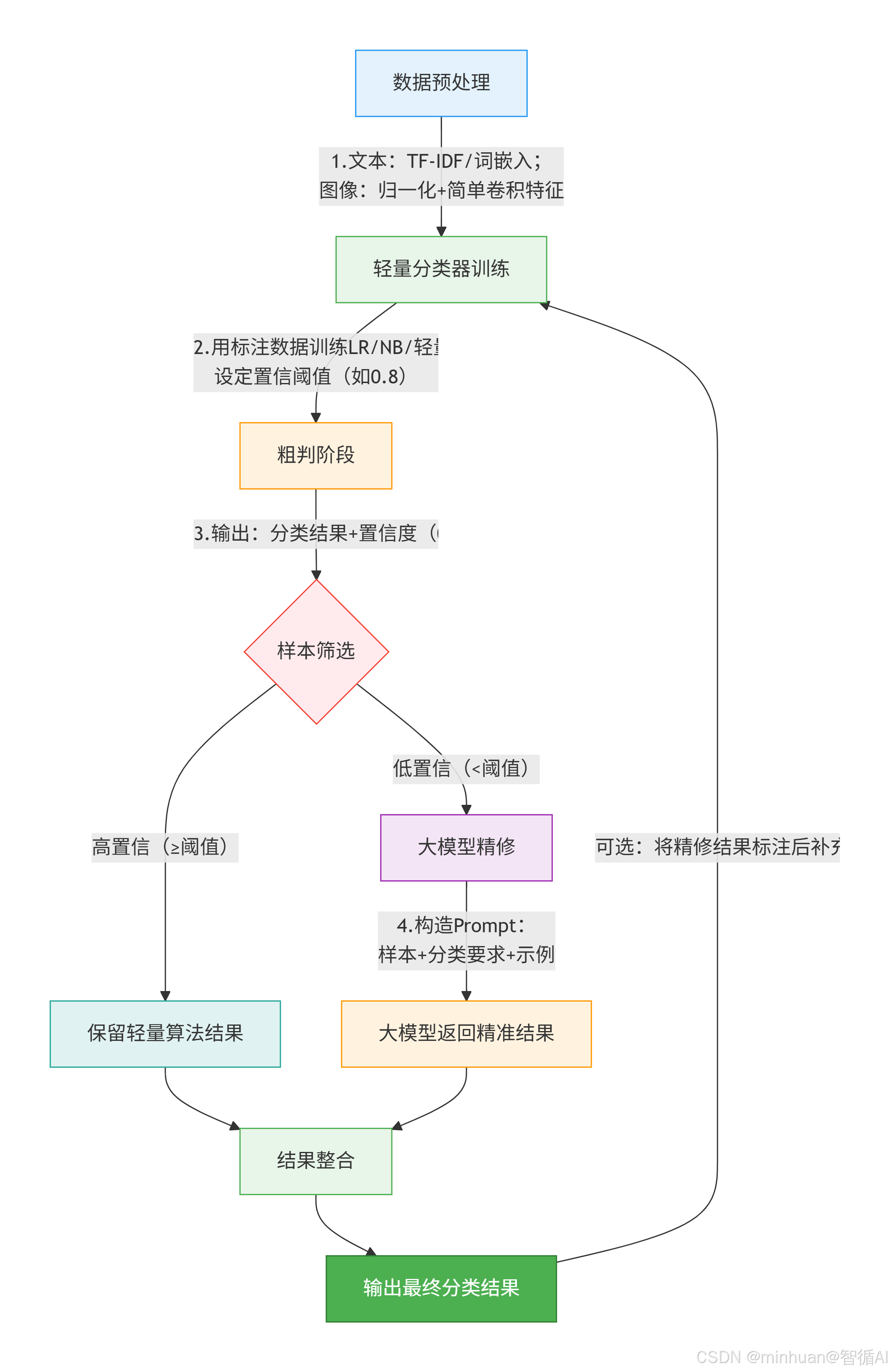 如何在数据有限的前提下,平衡准确率、成本与稳定性,成为AI落地的关键破局点。而大模型的出现,为这一难题提供了全新的解题思路,轻量分类算法与大模型的协同融合,并非简单的功能叠加,而是构建起"粗判 + 精修"的分层推理架构,让大模型的价值得到精准释放。让轻量算法负责快速筛选高置信度样本,筑牢落地的基础效率;大模型则专注处理疑难低置信样本,凭借深层语义理解与泛化能力,补齐传统算法的能力短板。这种模式既规避了纯大模型全量调用的成本浪费,又解决了轻量算法的精度瓶颈,让小样本学习从难以落地变为低成本稳落地。今天我们就全面拆解轻量算法与大模型协同的底层逻辑,助力大家掌握小样本场景下的大模型高效应用方法。