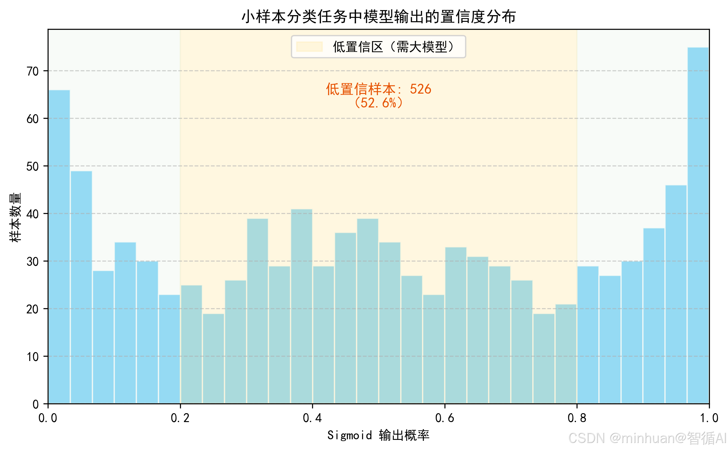 - 所以我们可以设定阈值(如 <0.2 或 >0.8)直接采纳结果,中间的交给大模型。