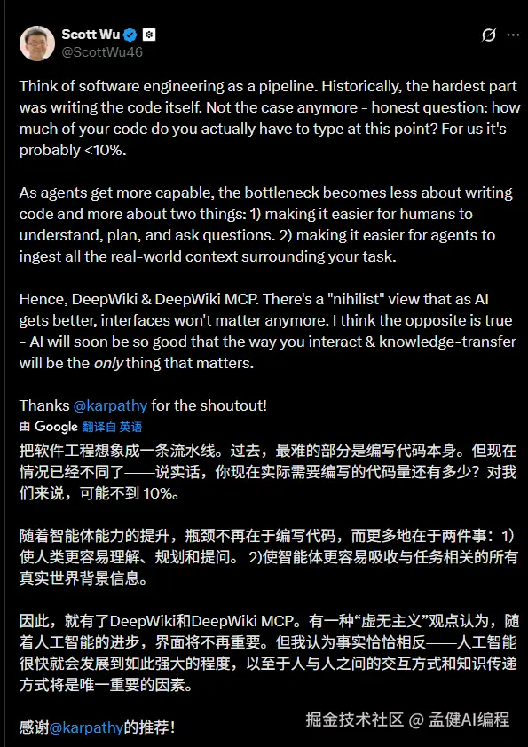 Scott Wu 说得好:"瓶颈不再是写代码本身,而是两件事------1)让人类更容易理解、规划和提问;2)让 AI 更容易获取任务的真实上下文。"