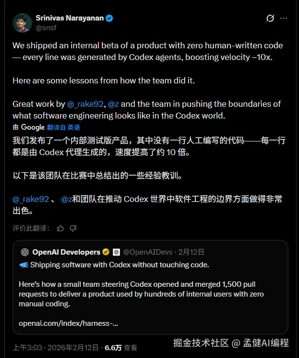 OpenAI:内部团队交付了一个完整产品,每一行代码都是 AI Agent 生成的。工程师全程没写一行代码,只负责 Review 和监督。开发效率提升了 10 倍。