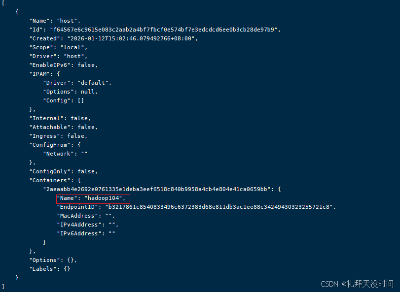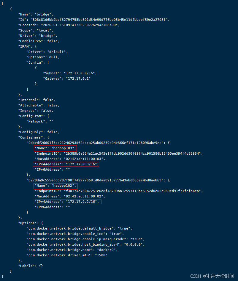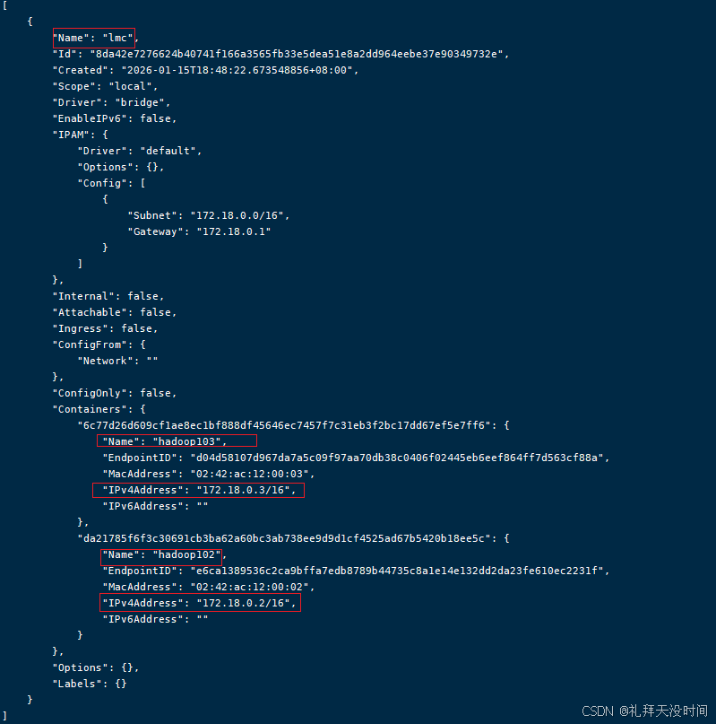 bash[root@hadoop108 ~]# docker network inspect lmc