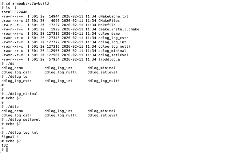 - 编出多档测试可执行文件(ddlog_minimal、ddlog_setlevel、ddlog_log_int 等),便于在设备上分步定位问题;