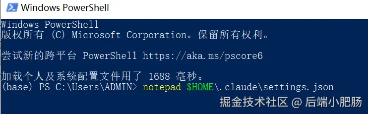 Claude Code安装好后还要配置一个大模型来驱动它。在电脑上打开Powershell,输入命令notepad $HOME.claude\settings.json