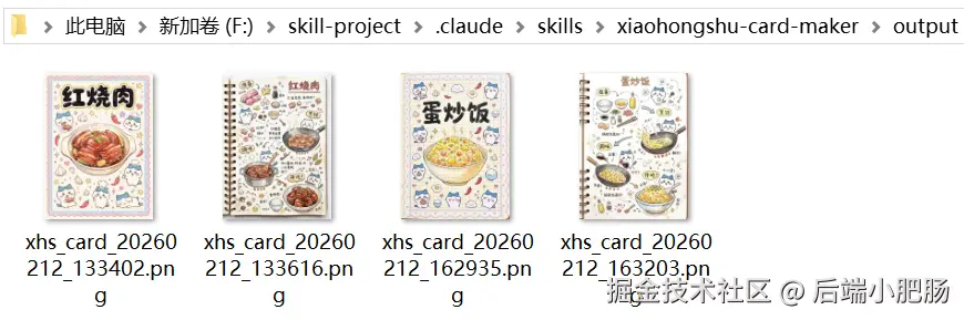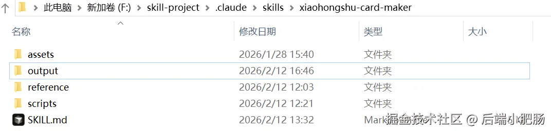 基于目录设计,在.claude目录下新建项目文件夹,如下图所示,我在F:\skill-project.claude\skills\目录下新建了xiaohongshu-card-maker目录。