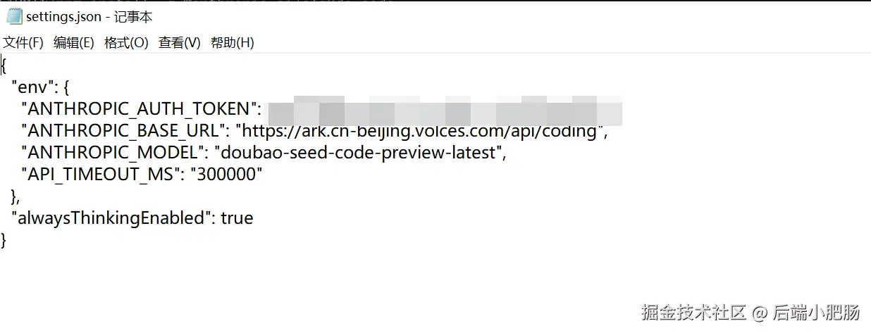 按一下键盘的上的回车键, 会弹出setting.js文件,这个文件是用来配置驱动claude code的大模型的,我这边用的是豆包编程模型。