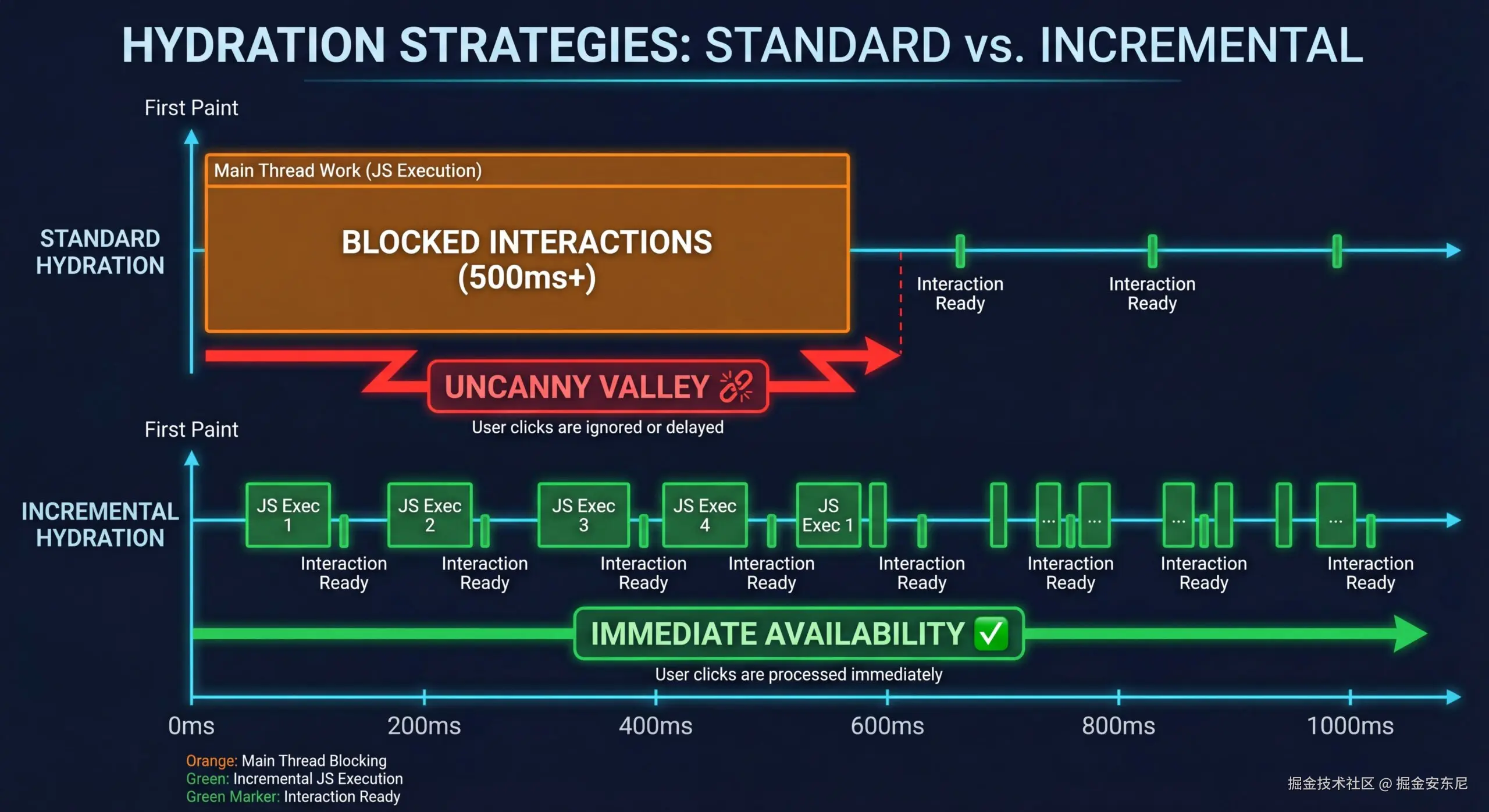 在传统水合(hydration)里,浏览器需要在主线程上启动框架、遍历 DOM、挂载监听器等。用户看到页面已经"完整",但点击按钮没有反应、菜单卡住------这段时间就像性能的"恐怖谷",通常发生在 LCP(内容已绘制)到 TTI(Time to Interactive)之间。