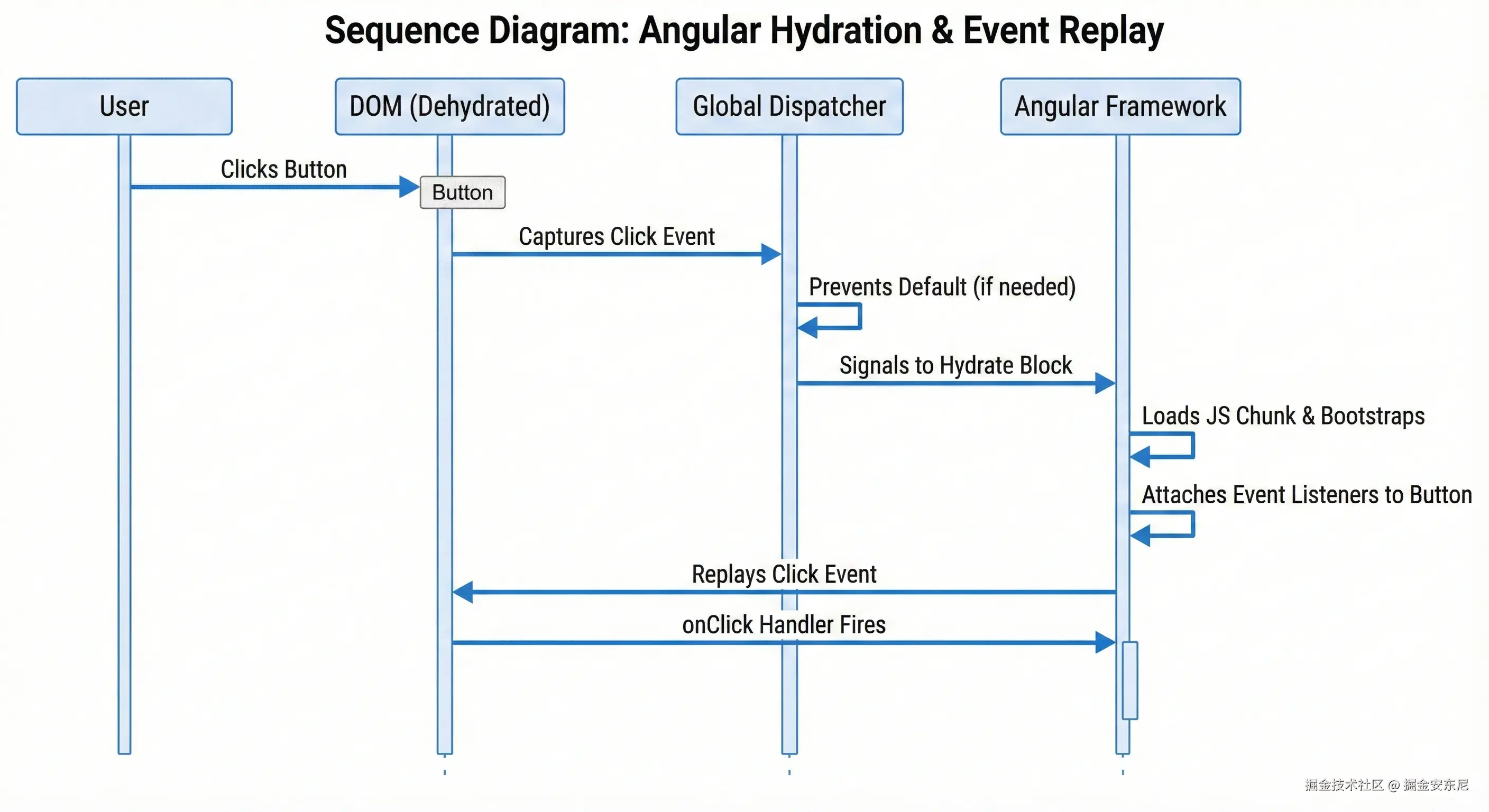 Angular 的思路是:在真正框架逻辑还没起来时,先用一段轻量脚本捕获事件,把它们缓冲起来,等对应块水合完成后再"回放"。在启用 withIncrementalHydration() 时,这类事件回放能力通常会一并启用(文档中也常提到 withEventReplay())。