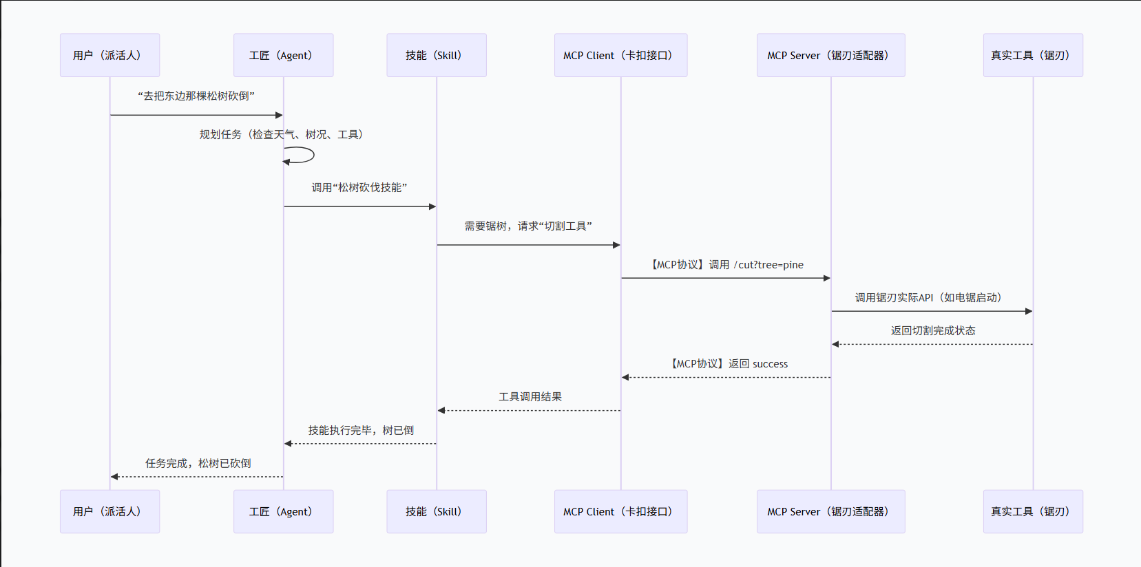 agent名曰智能体,就是去砍树的工匠。这是一种身份、角色。能自主决策、调用技能、使用工具 的主体。工匠不会只砍一棵树,他会根据天气、树的大小、工具状况来决定怎么砍。