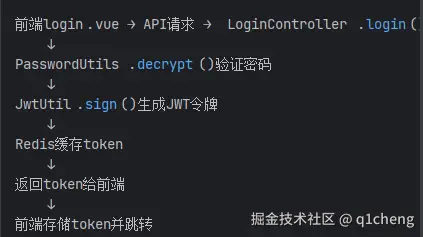前端登录请求 → 后端接收 → 密码验证 → JWT令牌生成 → 返回token → 前端存储token → 后续请求携带token → 权限校验