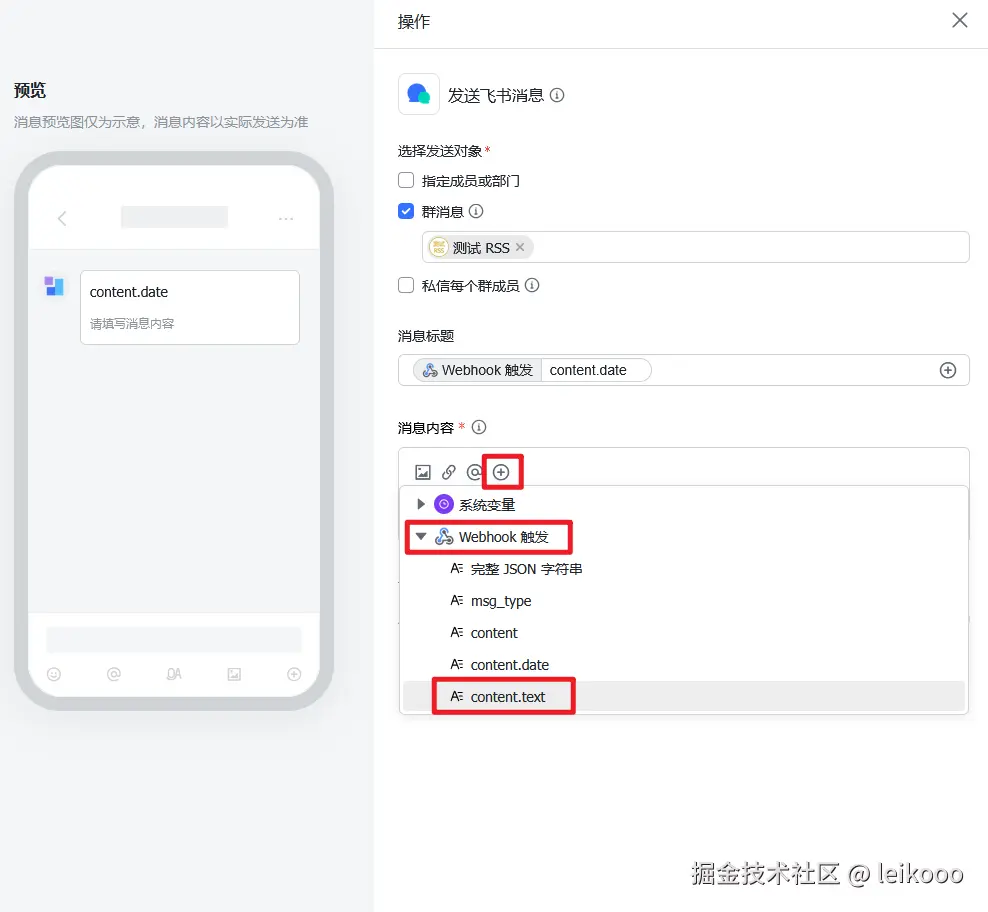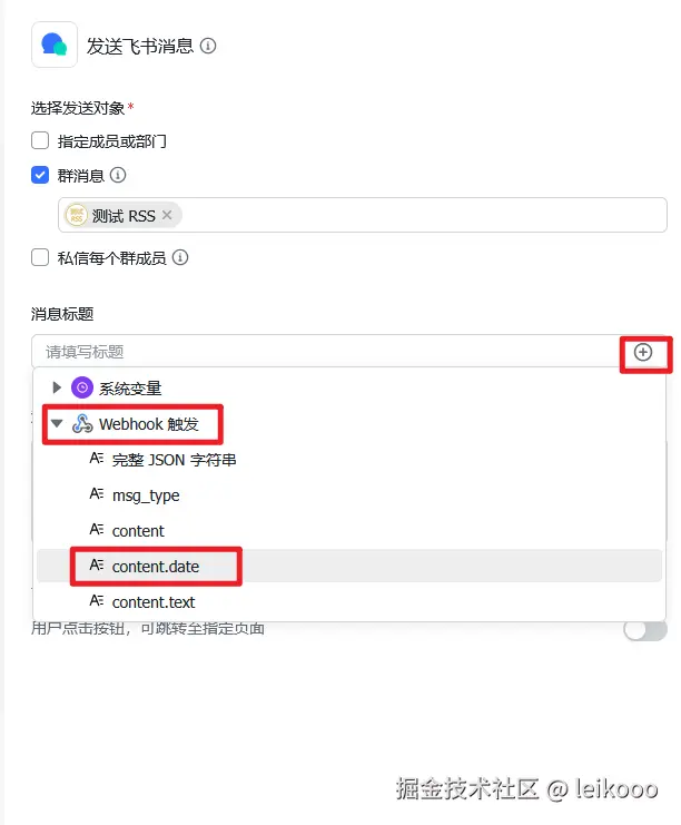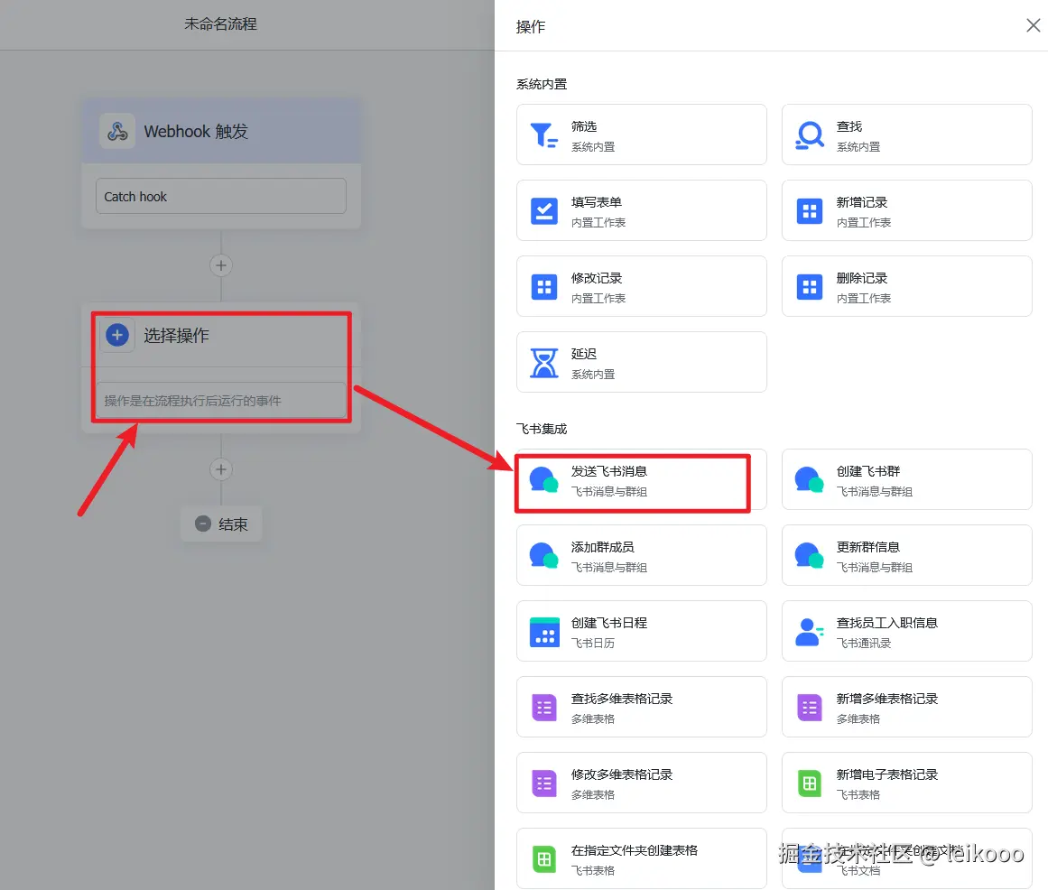 7、点击选择操作 → 选择飞书集成中的发送飞书消息: