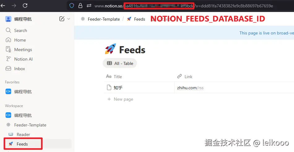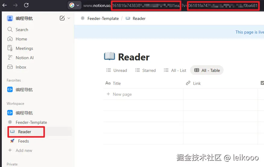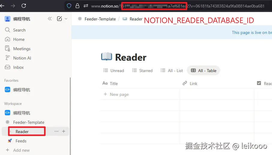 8、以此类推拿到 Reader、Feeds 的 database_id,也就是下面的 NOTION_READER_DATABASE_ID、NOTION_FEEDS_DATABASE_ID,我们后面都需要用到,可以提前记录一下。