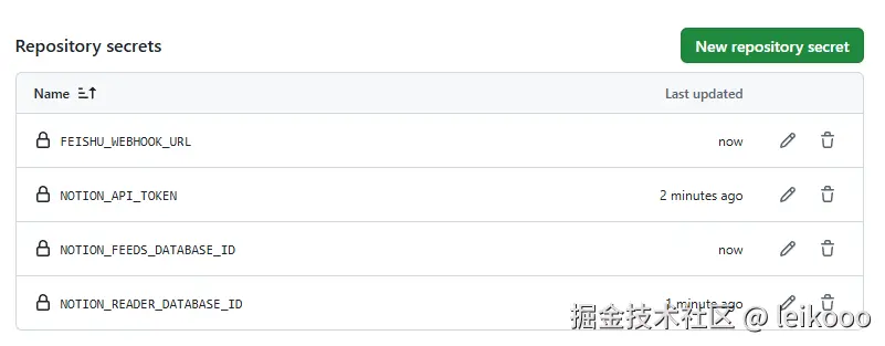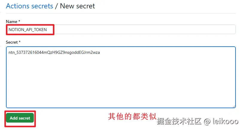 比如这里添加一个 NOTION_API_TOKEN,其他几个以此类推: