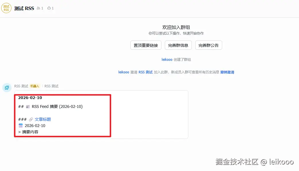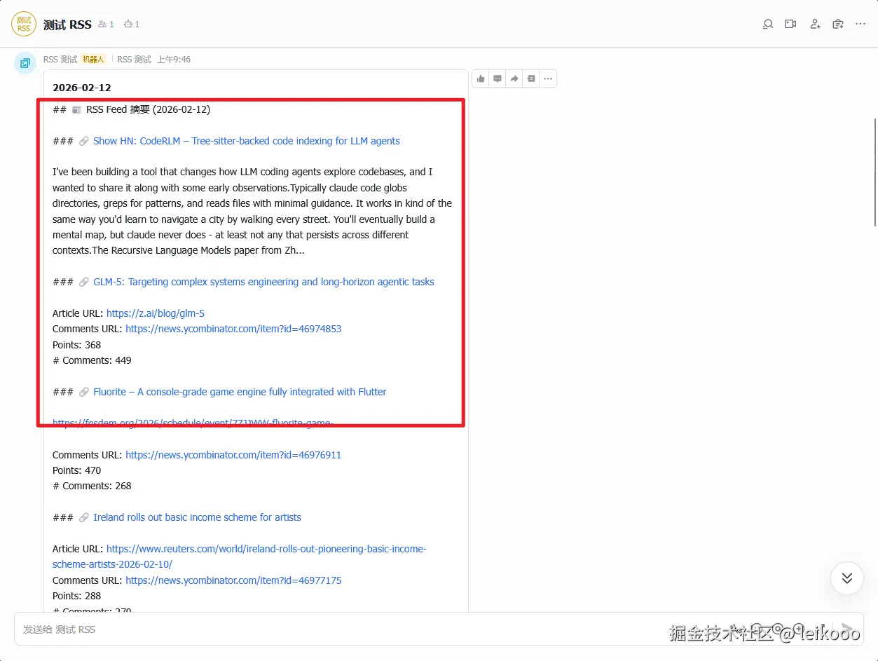 - 同时,每日摘要会通过飞书机器人推送到群组,确保你不会错过任何重要更新