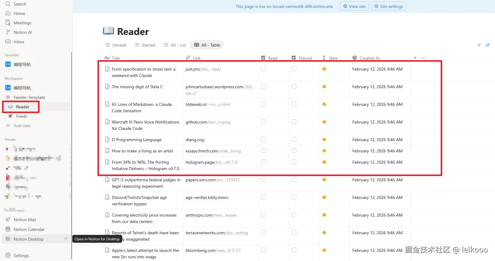 - 新文章会自动写入 Notion Reader 数据库,你可以随时随地在 Notion 中阅读