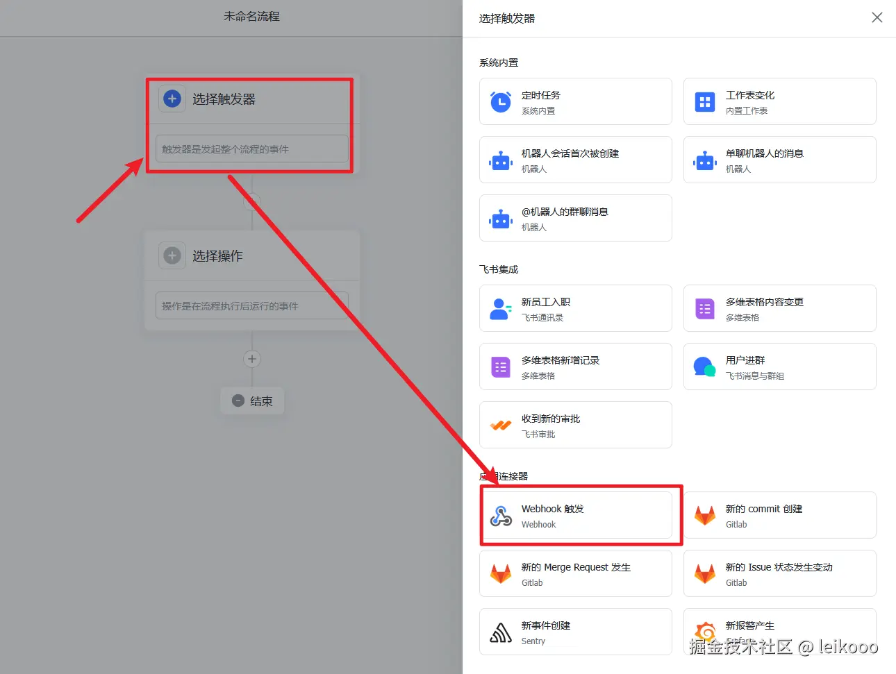 5、点击选择触发器 → 找到应用连接器中的 Webhook 触发: