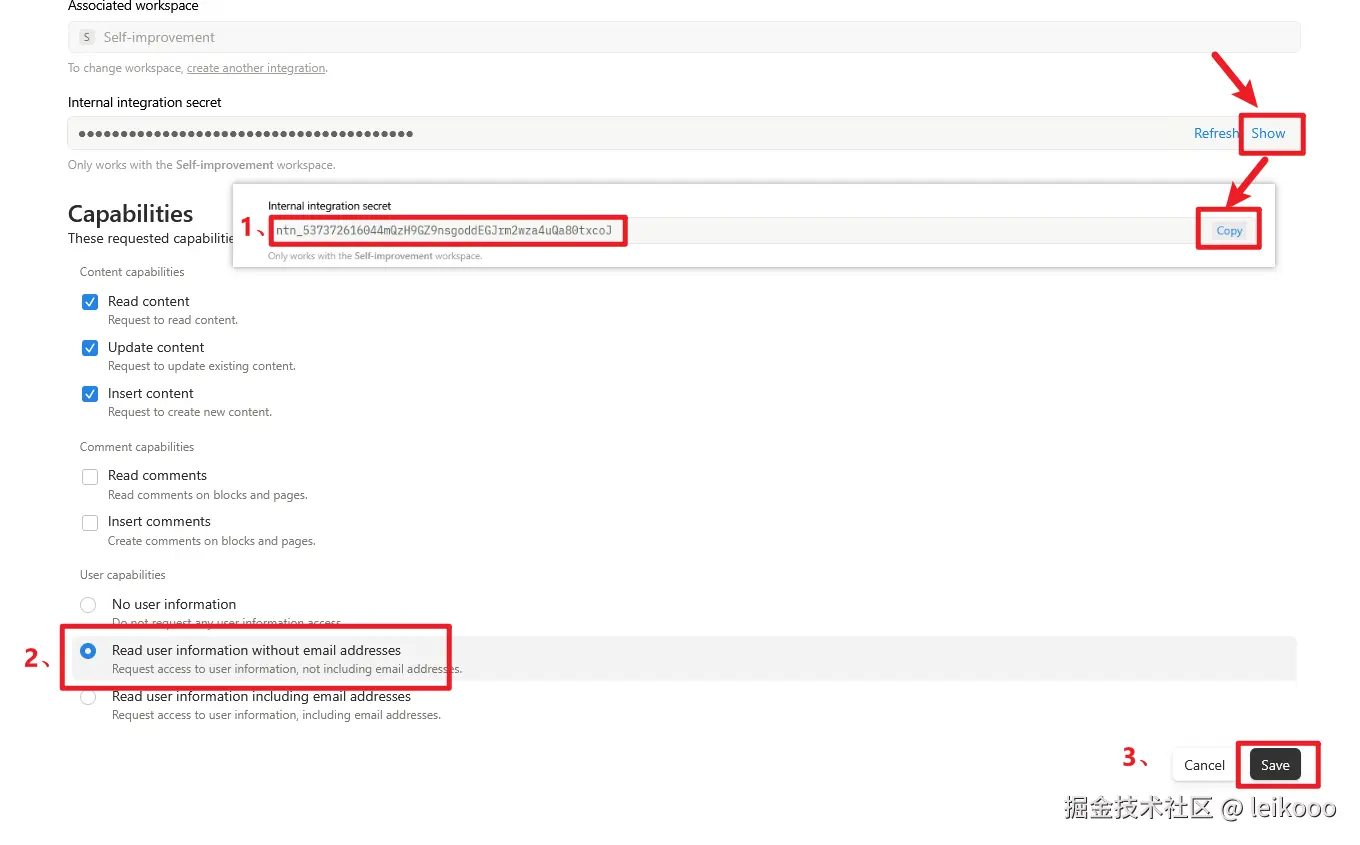 之后在 Internal integration secret 选择 show 之后就可以看到 Copy 按钮,这个就是 NOTION_API_TOKEN,并且设置 User Capabilities 选择 Read user info without email address,最后点击 Save 即可。