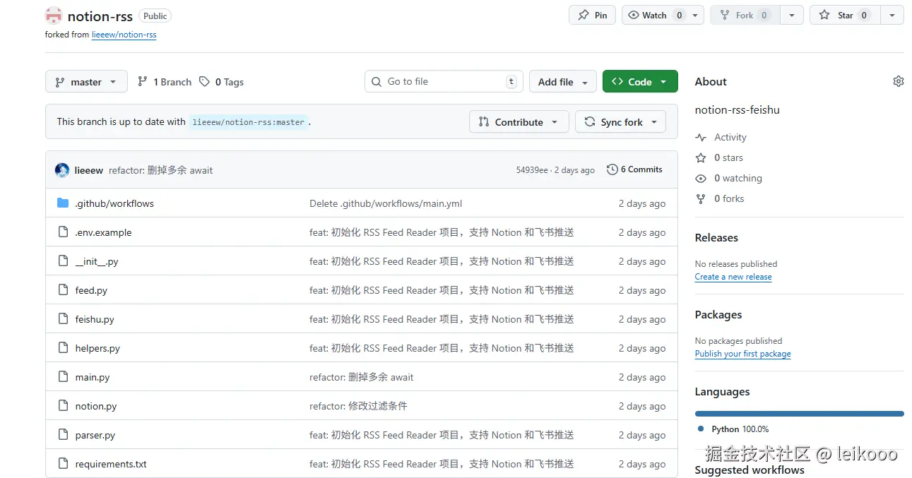 流程:每天通过 GitHub 定时任务,自动抓取 RSS 订阅源的文本和链接,保存到 Notion 数据库中,并通过飞书 Bot 发送摘要到群里。