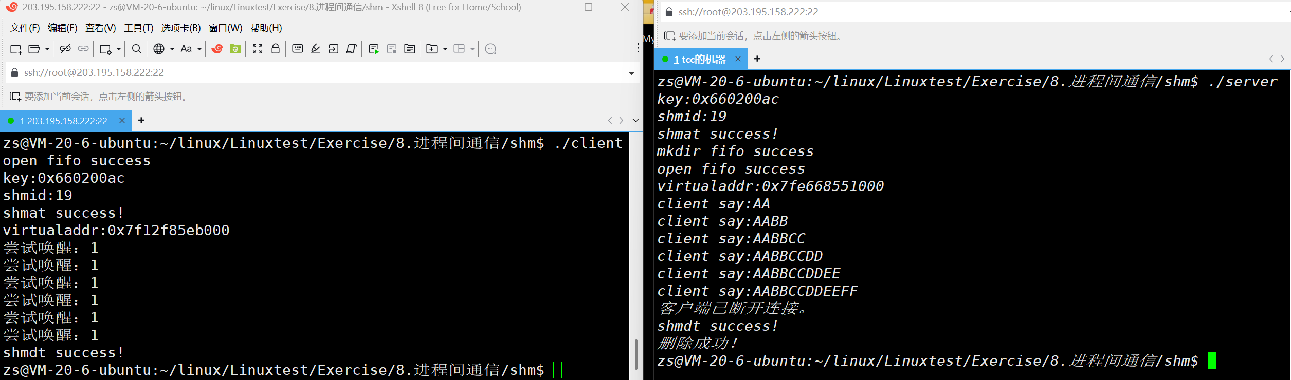 sem_read) → 读共享内存 → V (sem_write);- 效果:客户端写完才能唤醒服务端读,服务端读完才能唤醒客户端写,严格保证 "写→读→写" 的顺序。