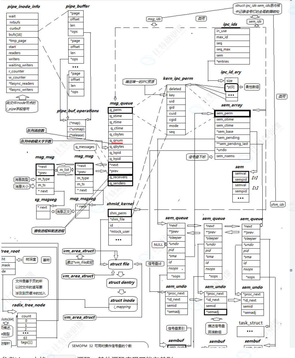 1、我们知道System V IPC的ds结构体(图中红框)中第一个成员的类型都是kern_ipc_perm(typedef为ipc_perm)类型结构体,所以内核就以一个数组:kern_ipc_perm* ipc_id_ary[N] 来组织所有ipc资源,因为ipc资源的各种ds结构体和kern_ipc_perm结构体的起始地址是一样的,能拿到kern_ipc_perm结构体的地址,再进行特定强转就能访问整个ds结构体,如 (msg_queue*)ipc_id_ary[5]。